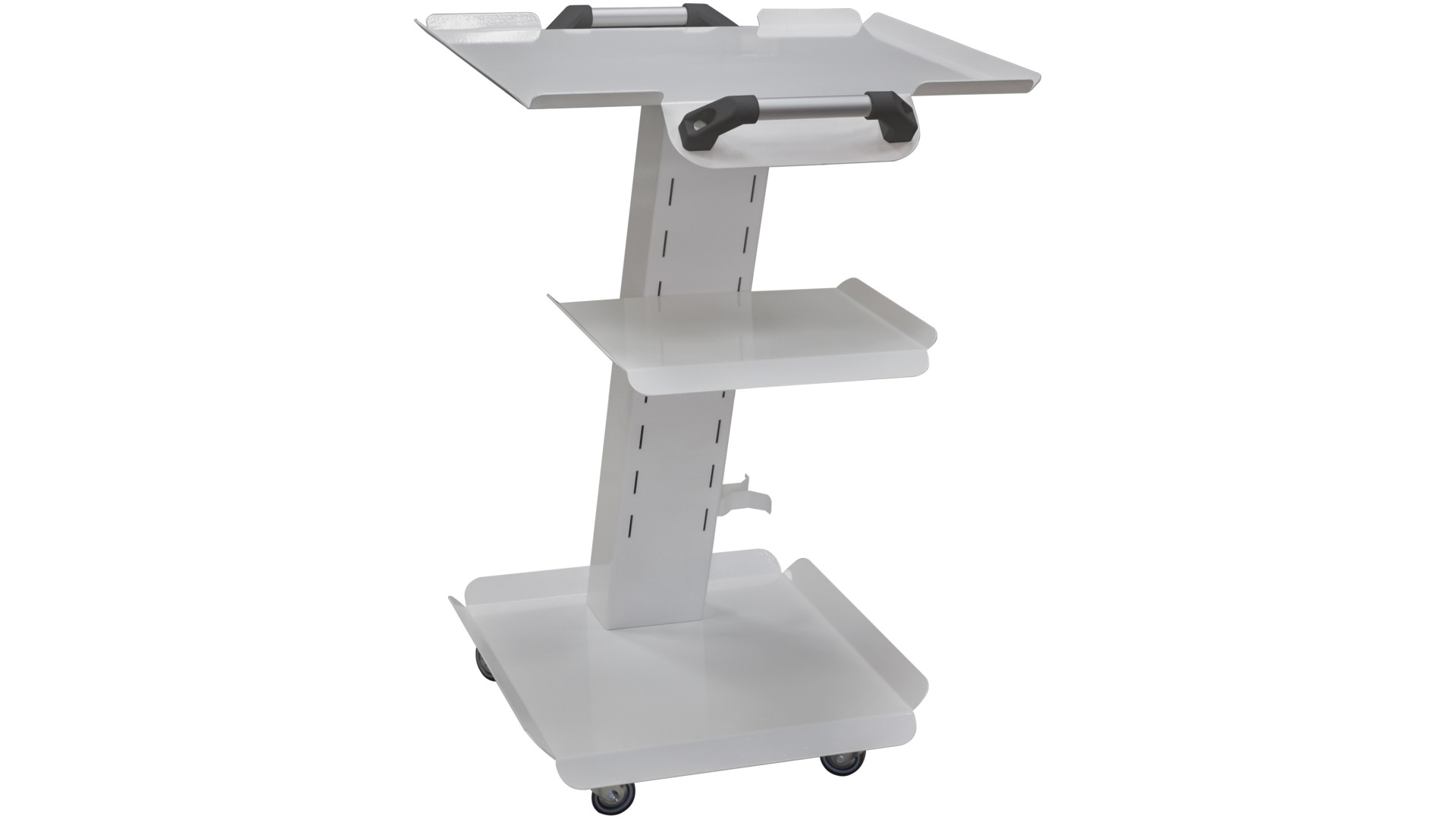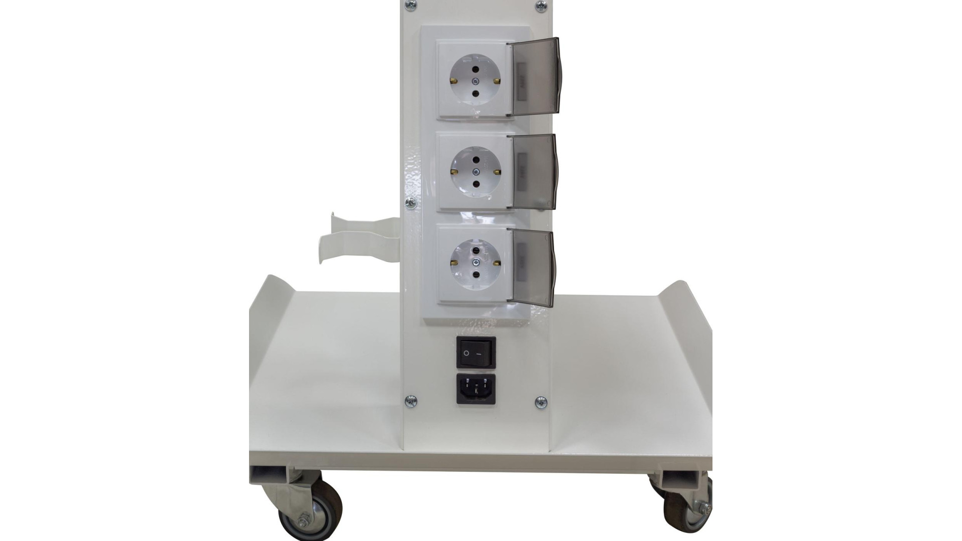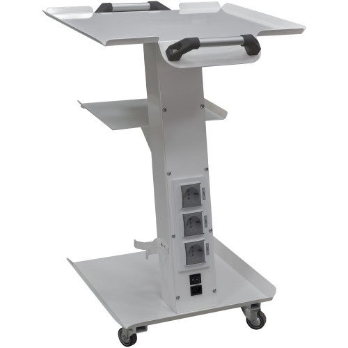 Рабочая поверхность приборной стойки состоит из трех полок. На них предусмотрены выступающие бортики, которые не дают инструментам падать на пол. Полки имеют разный размер, поэтому на них удобно разместить любую оснастку. Средняя полка съемная, а также может регулироваться по высоте. Центральная часть стойки оснащена тремя розетками, в которые подключаются приборы. Они дополнены заземлением, включателем и разъемами для кабелей. Стойка перемещается на четырех поворотных колесах. Она очень прочная, поэтому выдерживает нагрузку до 130 кг.