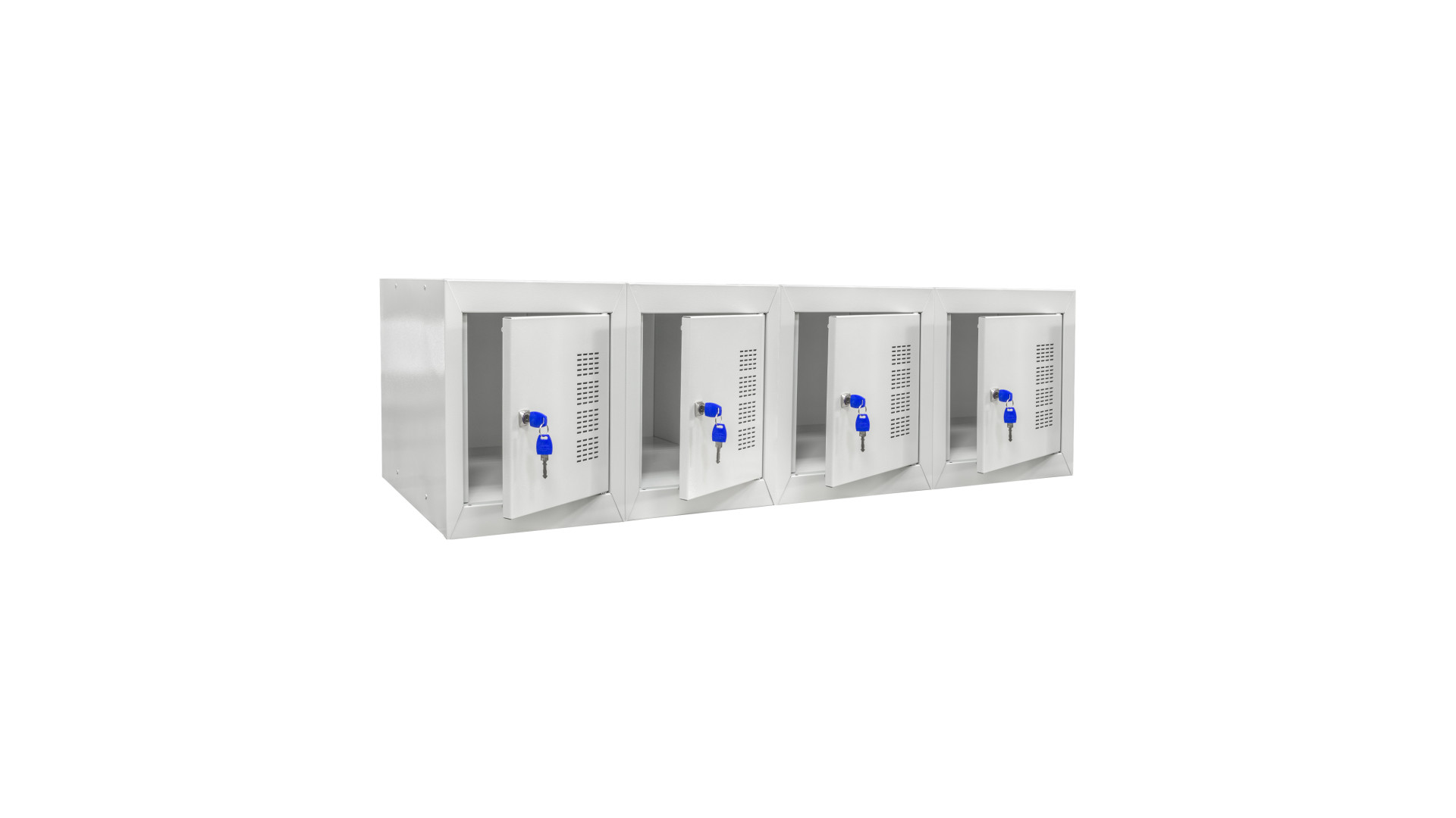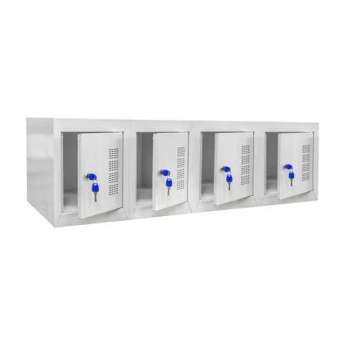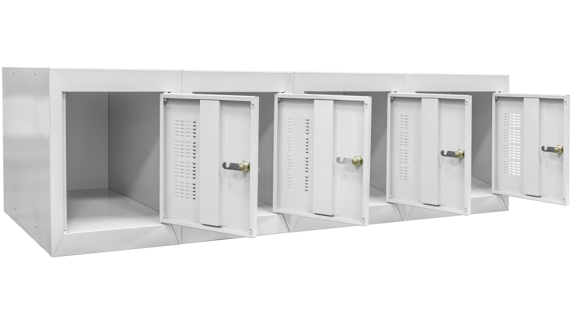 Изделие изготавливается из листовой стали и имеет прочный корпус, устойчивый к ежедневной нагрузке. Элементы конструкции соединены межсекционными креплениями и метизами, что гарантирует жесткость и долговечность. Поверхность металла проходит антикоррозийную обработку, после чего покрывается порошковой краской RAL 7035, устойчивой к влаге и царапинам. Для удобства использования дверцы оборудованы замковой системой с ключом, а при необходимости можно установить кодовый, навесной или бесконтактный замок.