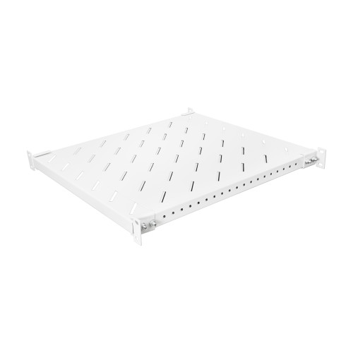 Допустимая глубина монтажа – 450-750 мм. Эта особенность обеспечивается раздвижной конструкцией, которая регулирует размеры. Полка может устанавливаться в большинстве шкафов и стоек. Она изготовлена из прочной стали, которая не прогибается под тяжелым оборудованием. Поскольку устройства нагреваются в работе, панель имеет отверстия охлаждения воздухом – это продлевает эксплуатацию и предотвращает скапливание пыли.