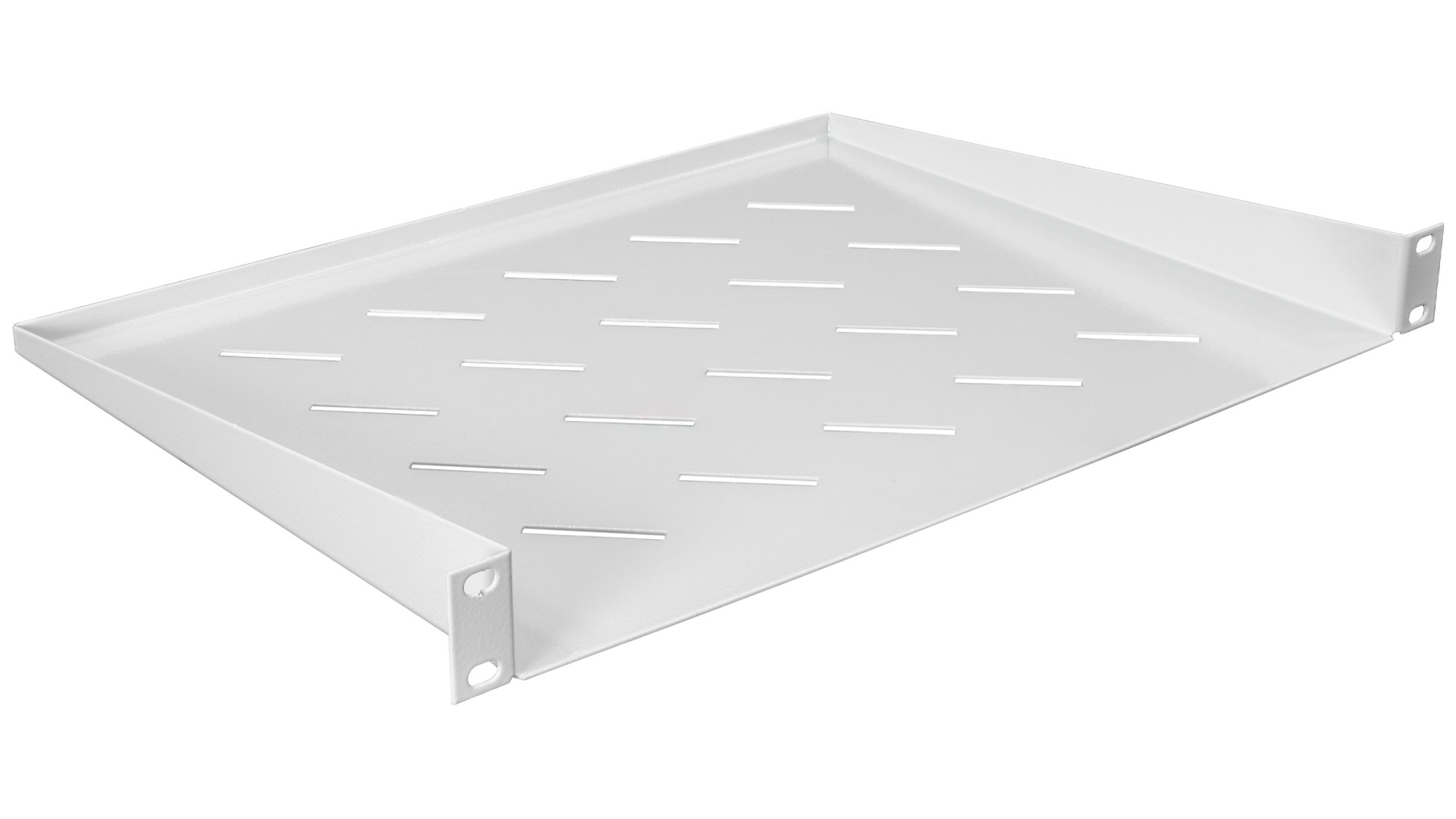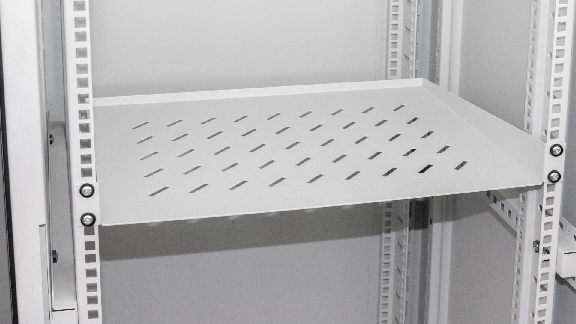 Металлическая консольная полка может монтироваться в напольные или настенные серверные шкафы. Крепление осуществляется по бокам с помощью заушин. Полка выполнена из прочной листовой стали. Она имеет перфорацию, которая способствует циркуляции воздуха. Благодаря этому к оборудованию поступает прохладный воздух, и техника меньше перегревается.