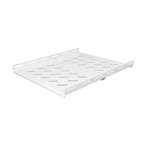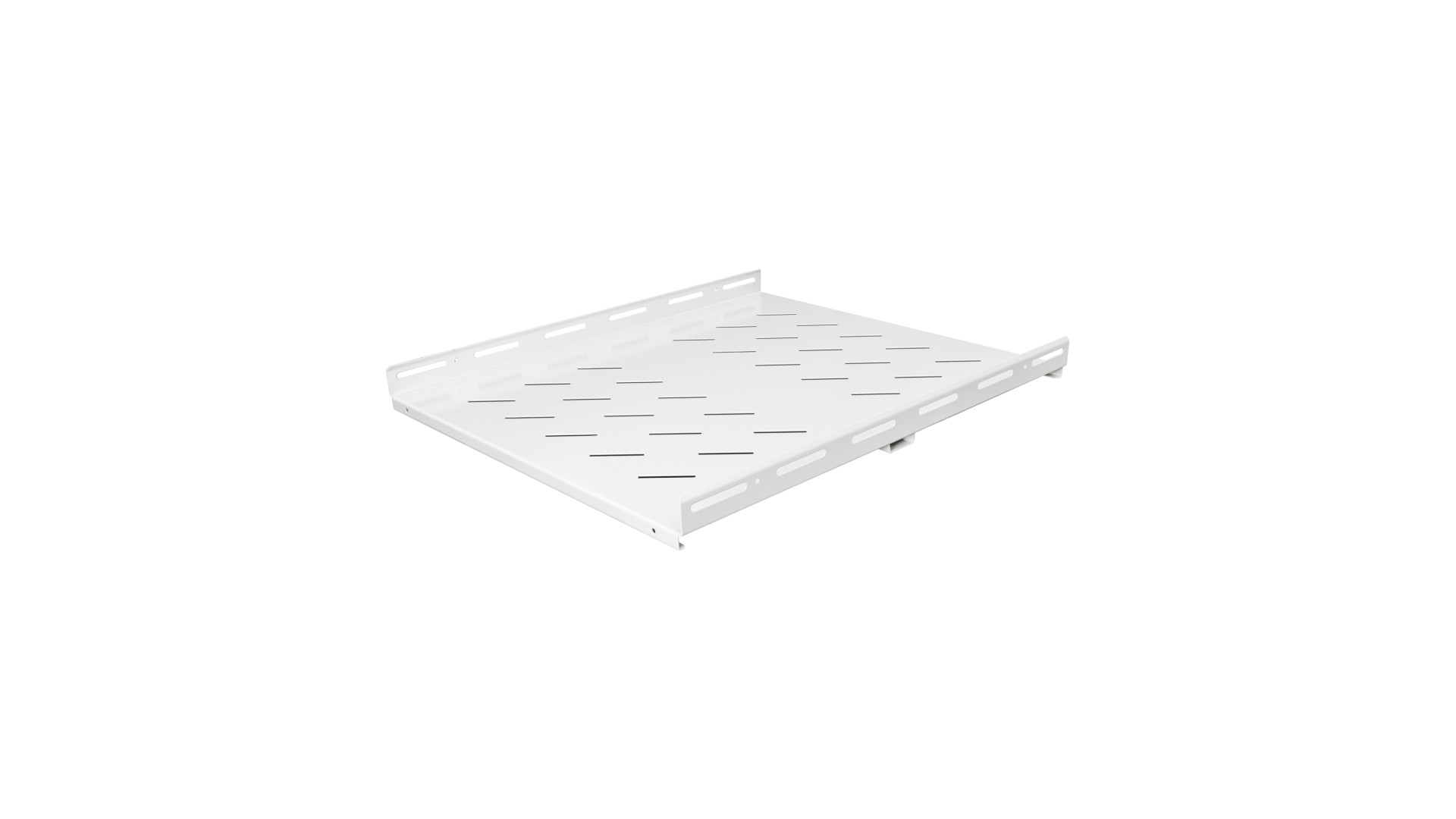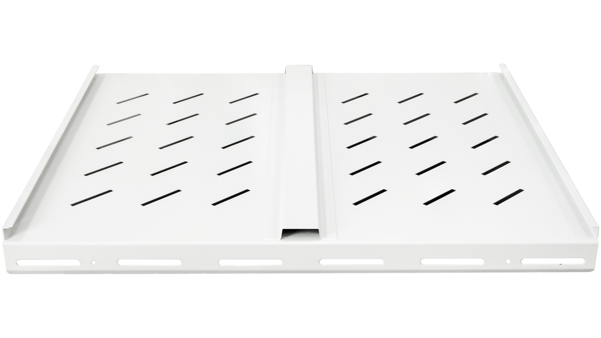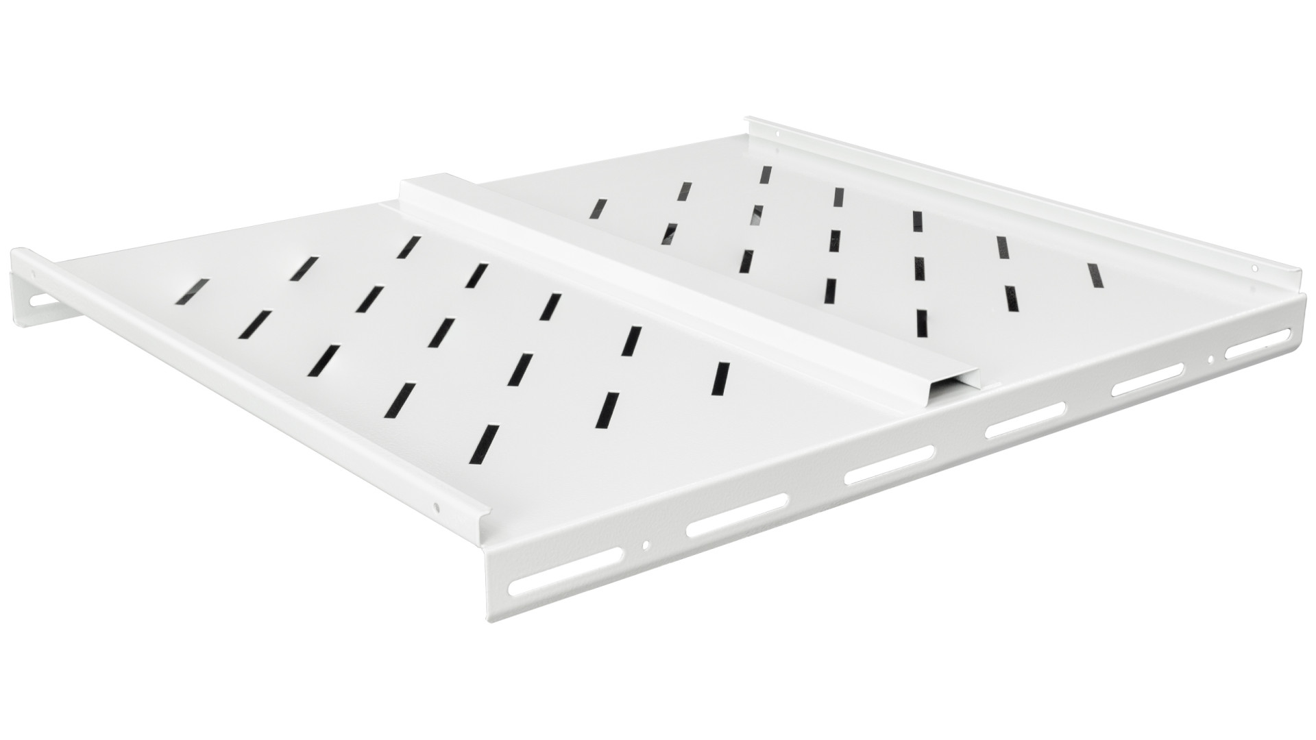 Полотно полки изготавливается из прочного металла. Это дает устойчивость к постоянные статическим нагрузкам в течение всего срока эксплуатации. Материалы проходят процедуру фосфатации, которая придает стойкость к коррозии. Поверхность изделия покрывается порошковой краской светло-серого цвета. Прочное покрытие долго не изнашивается в условиях перепада температур и повышенной влажности. По полотну и краям полки находятся прорези, размещенные в несколько рядов. Благодаря ним воздух циркулирует внутри шкафа. Данное решение не позволяет приборам перегреться во время работы.