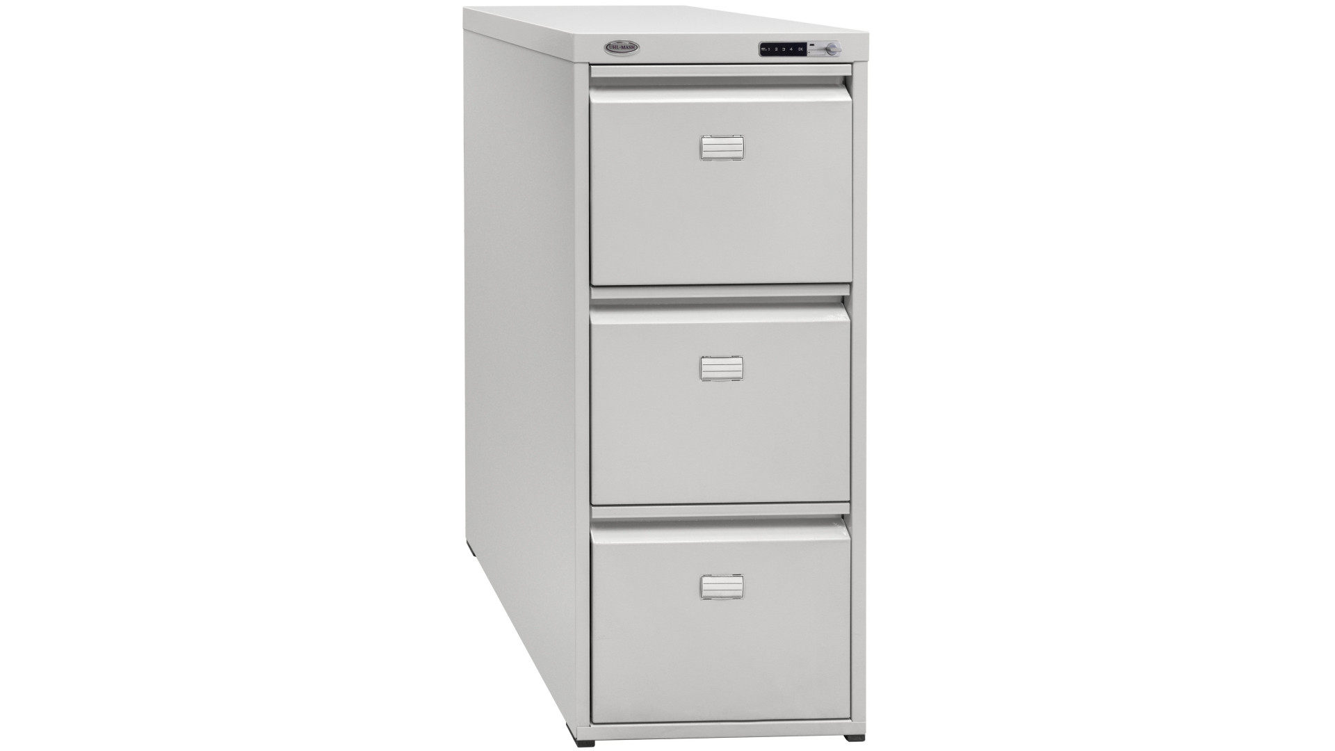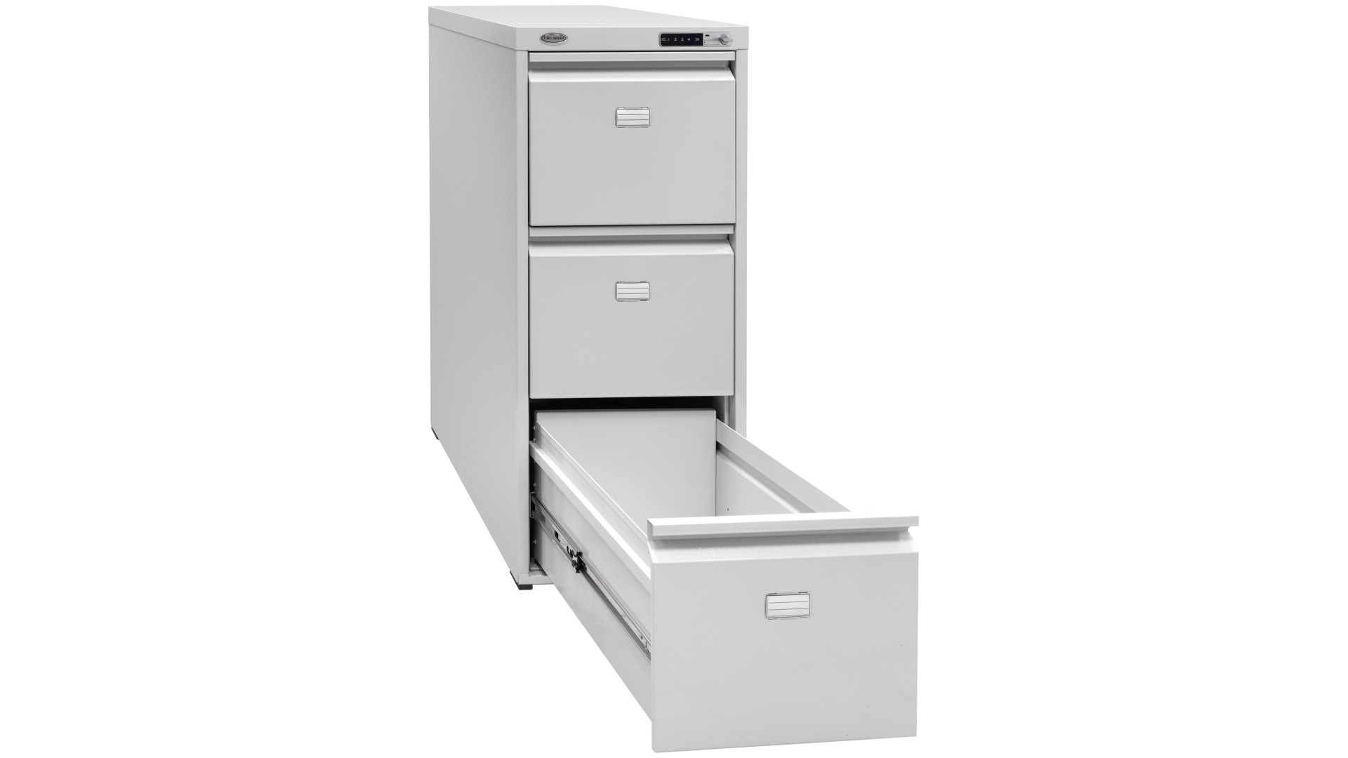 Модель состоит из трех выдвижных ящиков. Электронный замок обеспечивает надежное запирание и упрощает доступ для персонала. Механизм телескопических направляющих обеспечивает полное выдвижение ящиков для удобной работы с документами. Система антиопрокидывания блокирует открытие других отделений, если одно уже открыто. Это техническое решение предотвращает падение конструкции под весом документов. Пластиковые идентификаторы на фасадах помогают быстро ориентироваться в архивах.