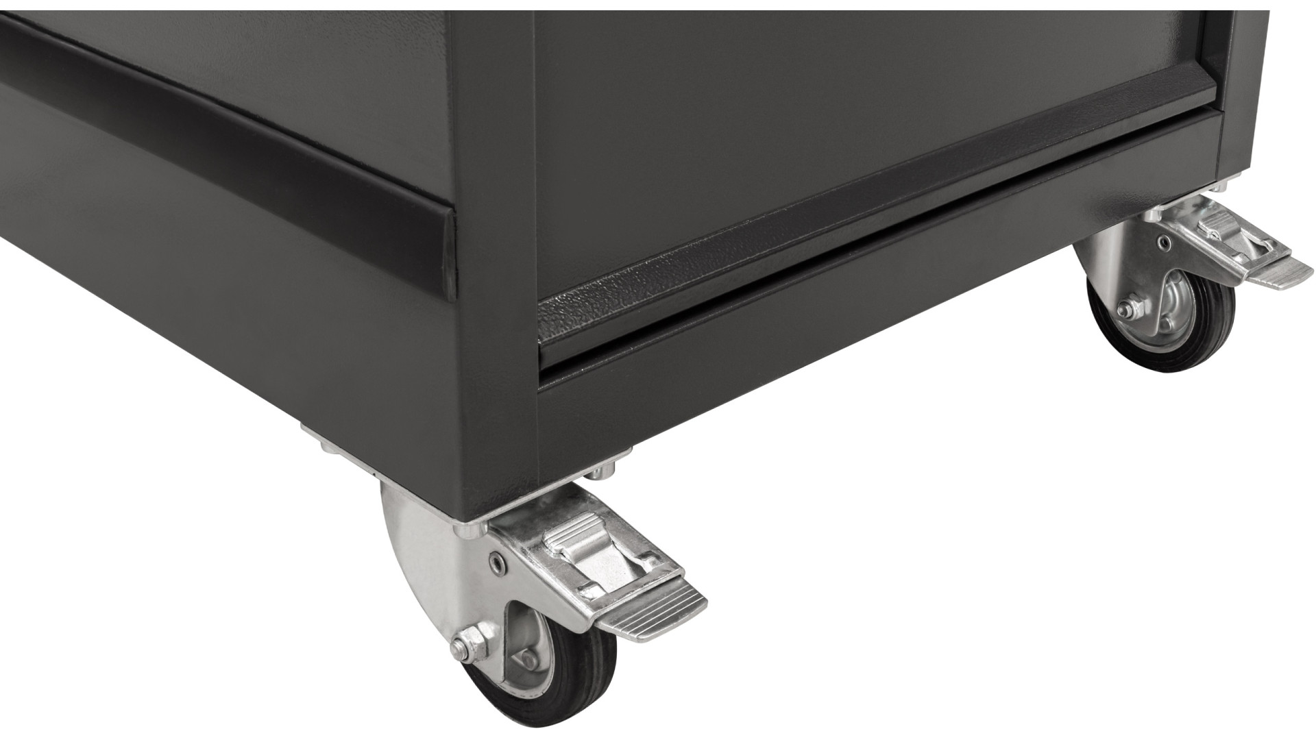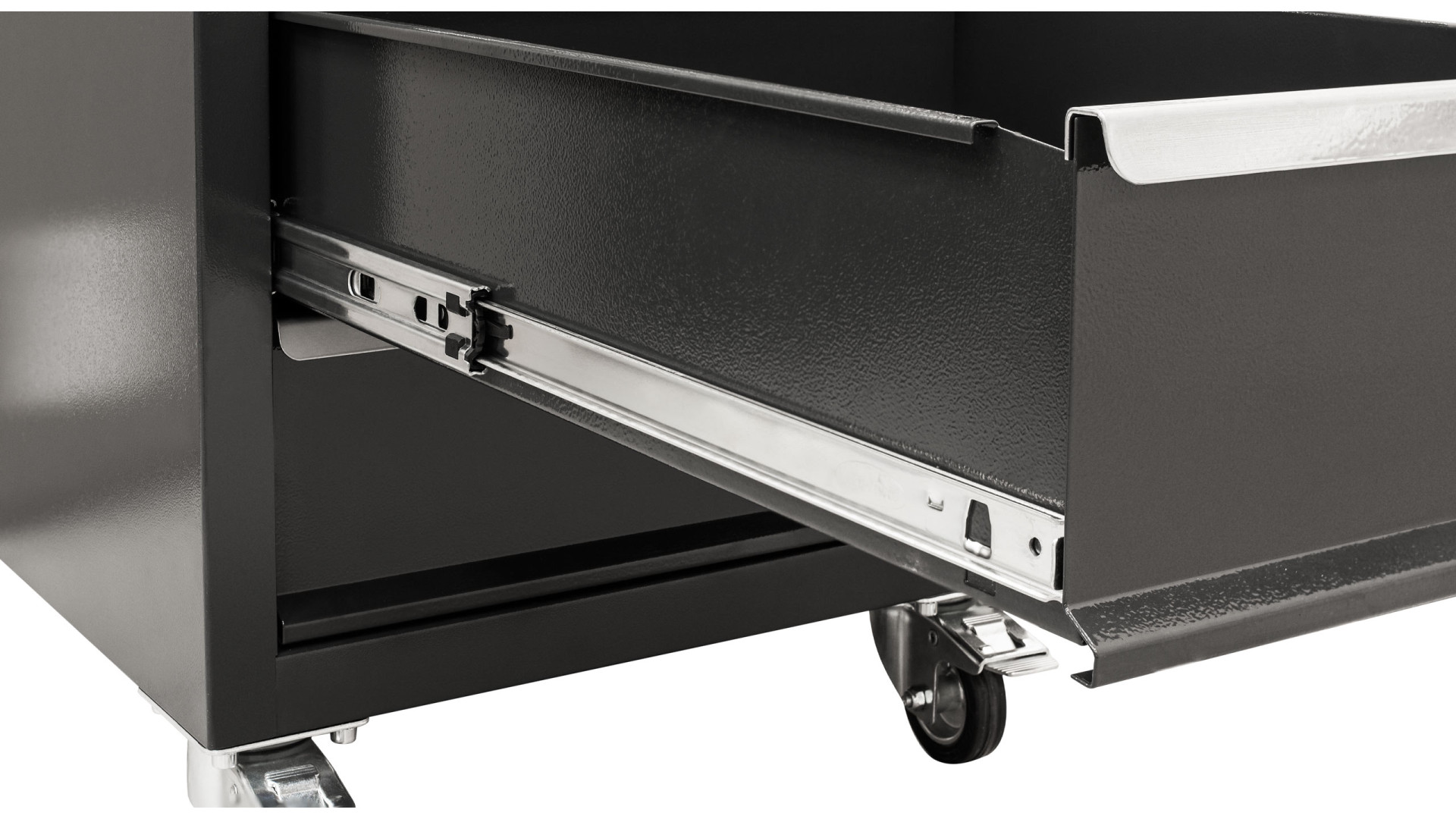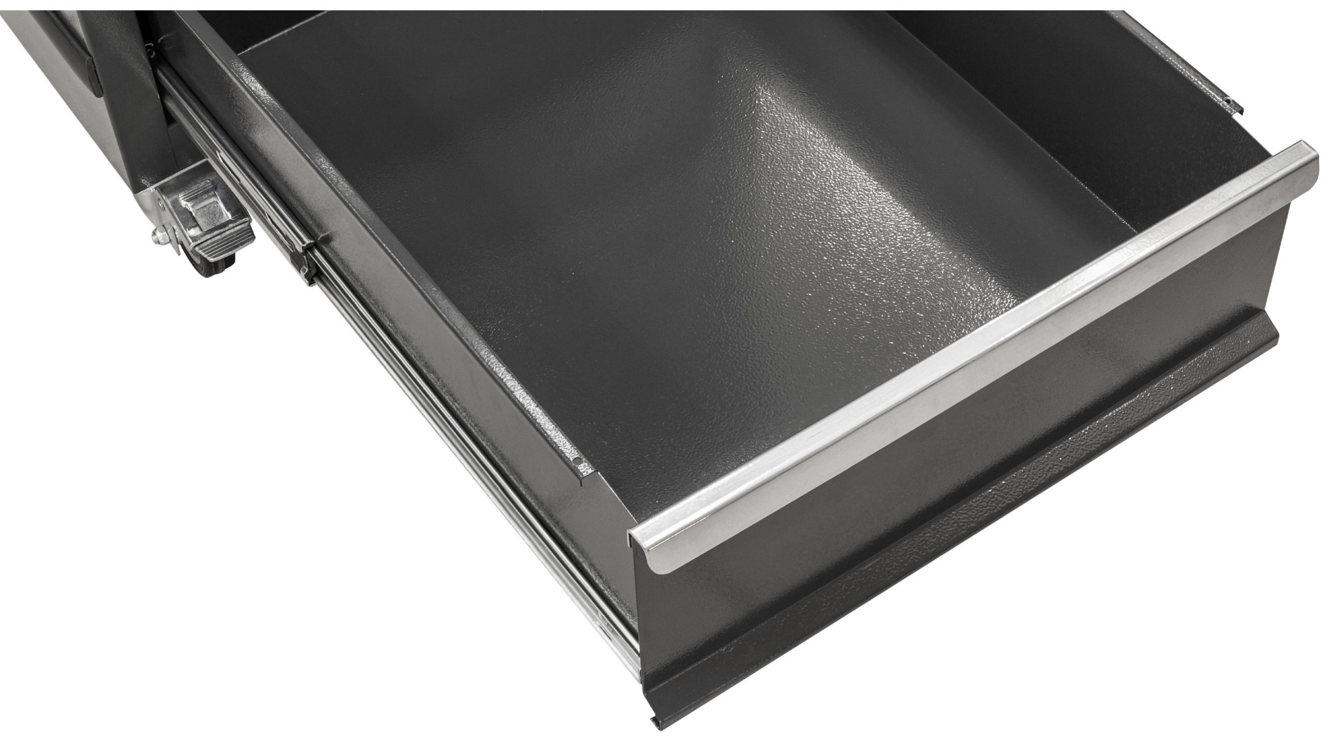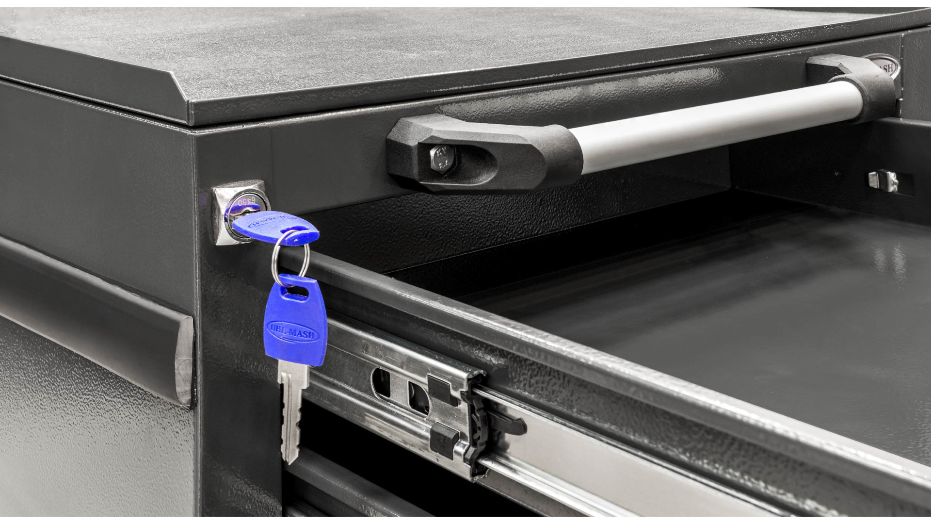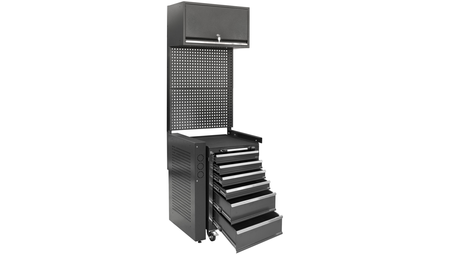 Модель оборудована шестью ящиками разных размеров для удобного распределения ручного инструмента, комплектующих и габаритных предметов. Телескопические направляющие с доводчиком обеспечивают плавное выдвижение. Дополнительное место создает антресоль, а перфорированная панель позволяет закреплять подвесные инструменты. Максимальная нагрузка на ящик составляет 40 кг.