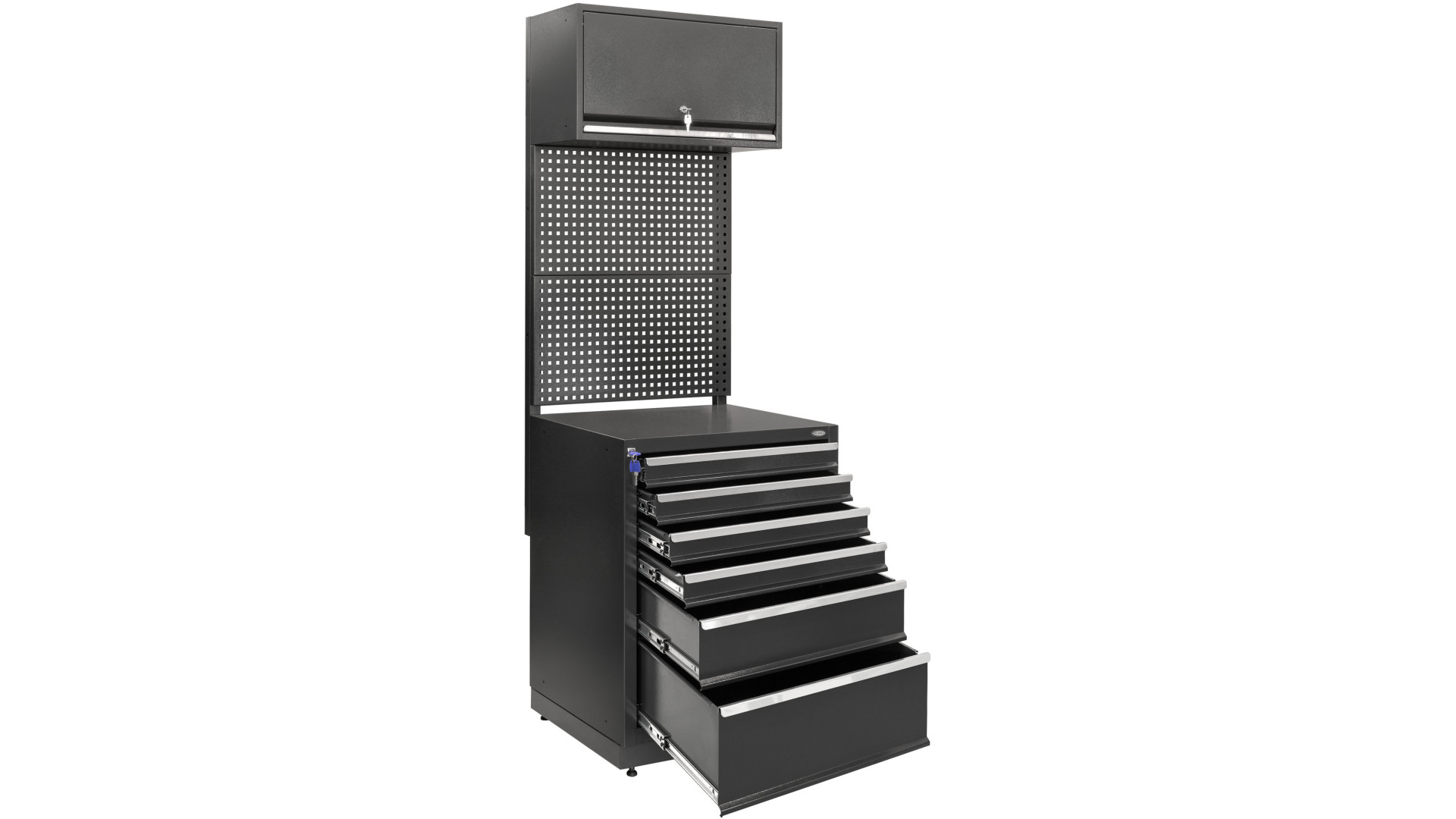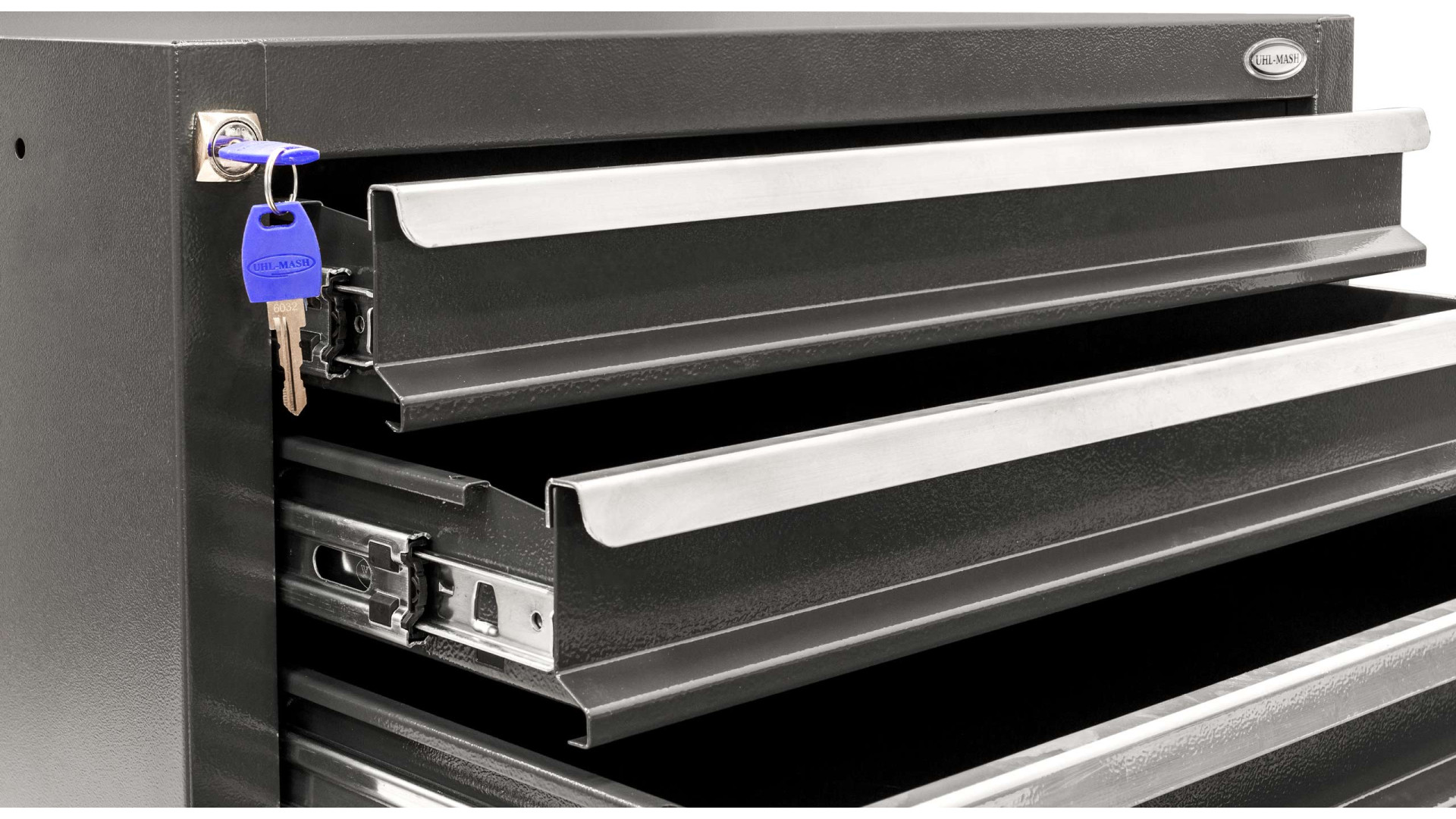 Блок оборудован ящиками различных типоразмеров на телескопических направляющих с доводчиками, которые обеспечивают плавное выдвижение. Каждый ящик выдерживает нагрузку до 40 кг, что позволяет хранить как мелкие детали, так и габаритные инструменты.