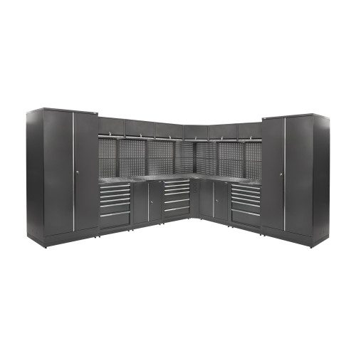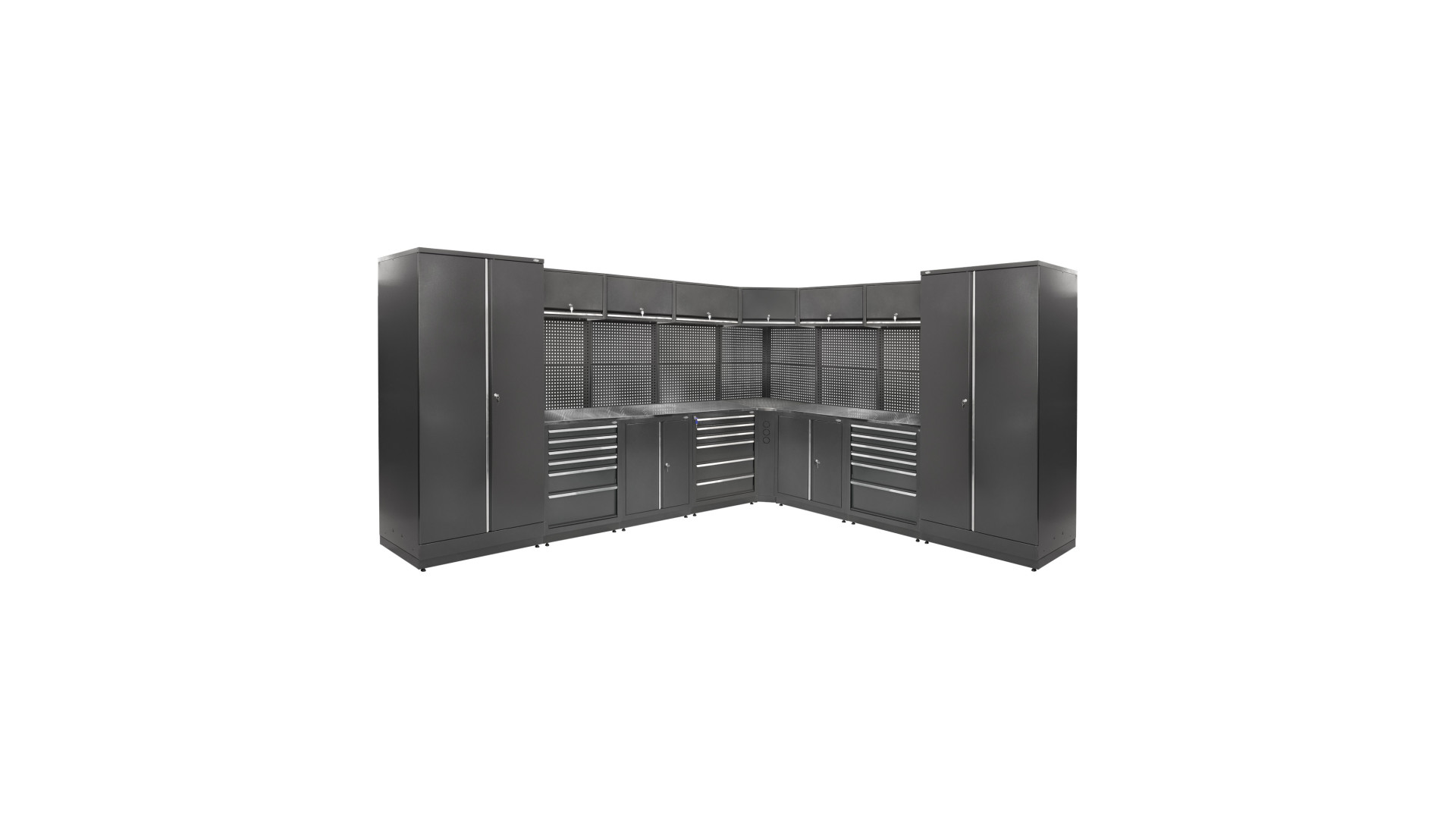 Модель изготовлена из стали с порошковым покрытием RAL7016 (антрацитово-серый), которое защищает от коррозии и износа. Габариты составляют 3725×3050×2020 мм, вес в зависимости от комплектации - от 668 до 687 кг. В составе предусмотрены шкафы MODUL 1000-4П и MODUL 1000 ОГ, блоки MODUL 3М3С, 4МСБ, Д и угловой модуль. Рабочую поверхность образуют две столешницы, которые формируют большую плоскость для выполнения задач.