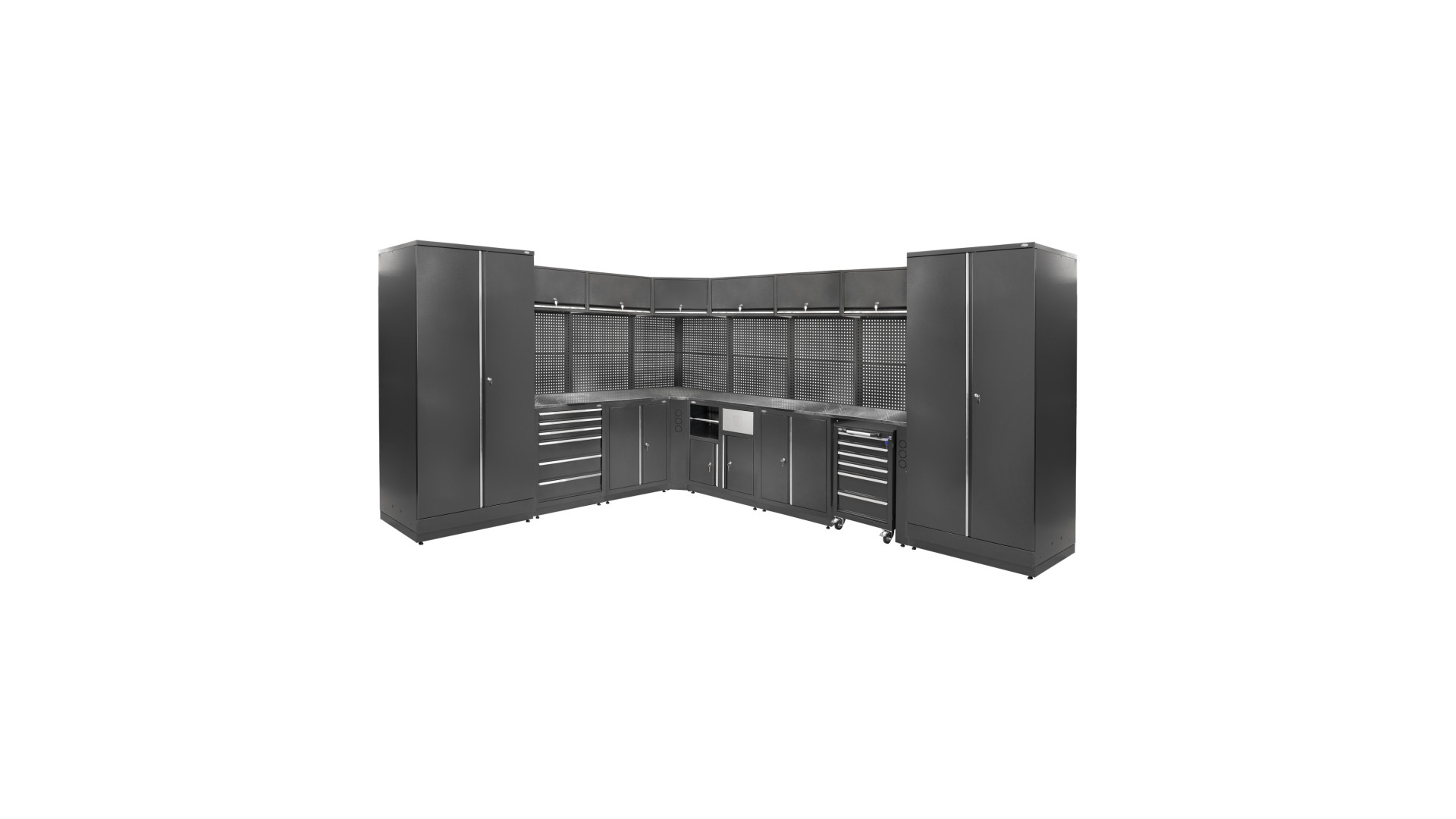 Система MODUL Л-08-002 имеет габариты 3725×3050×2020 мм, что делает ее пригодной для использования в больших мастерских и производственных помещениях. Вес конструкции зависит от выбранной конфигурации столешниц и составляет от 637 до 656 кг. Для изготовления применяется сталь с порошковым покрытием RAL7016 (антрацитово-серый), которое защищает поверхность от износа, влаги и коррозии. Модель относится к серии Corner, что обеспечивает эффективное использование рабочей площади благодаря угловой компоновке.
