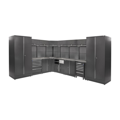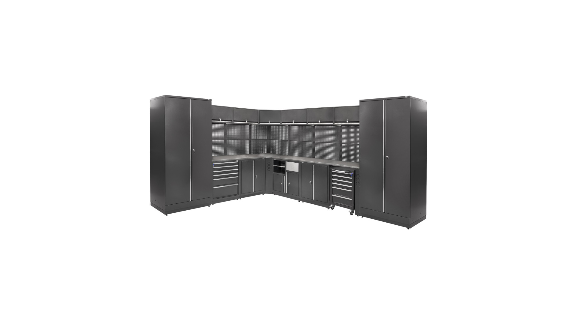 Модель имеет габариты 3725×3050×2020 мм при весе от 641 до 660 кг в зависимости от конфигурации. Система изготовлена из стали и покрыта порошковой краской RAL7016 (антрацитово-серый), что повышает устойчивость к механическому износу и воздействию влаги. Конструкция принадлежит к серии Corner, укомплектована шестью блоками и двумя шкафами, что обеспечивает достаточную вместимость для инструментов и материалов.