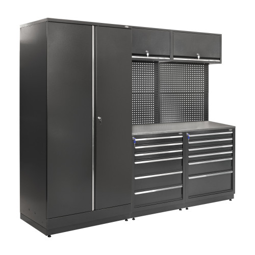 Такая компоновка позволяет рационально использовать рабочую площадь, размещая инструменты и оборудование в удобном порядке. При необходимости систему можно дополнять совместимыми элементами серии MODUL.