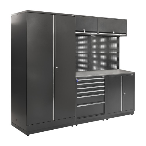 Система MODUL Л-03-002 - это комплексное решение для обустройства рабочих зон, которое сочетает шкафы, блоки с выдвижными ящиками, столешницу и перфорированные панели. Конструкция используется в производственных помещениях, мастерских и сервисных зонах, где необходимо упорядочить инструменты и материалы и обеспечить эффективное использование пространства. Система формирует единый модуль, который можно адаптировать под конкретные задачи.