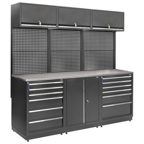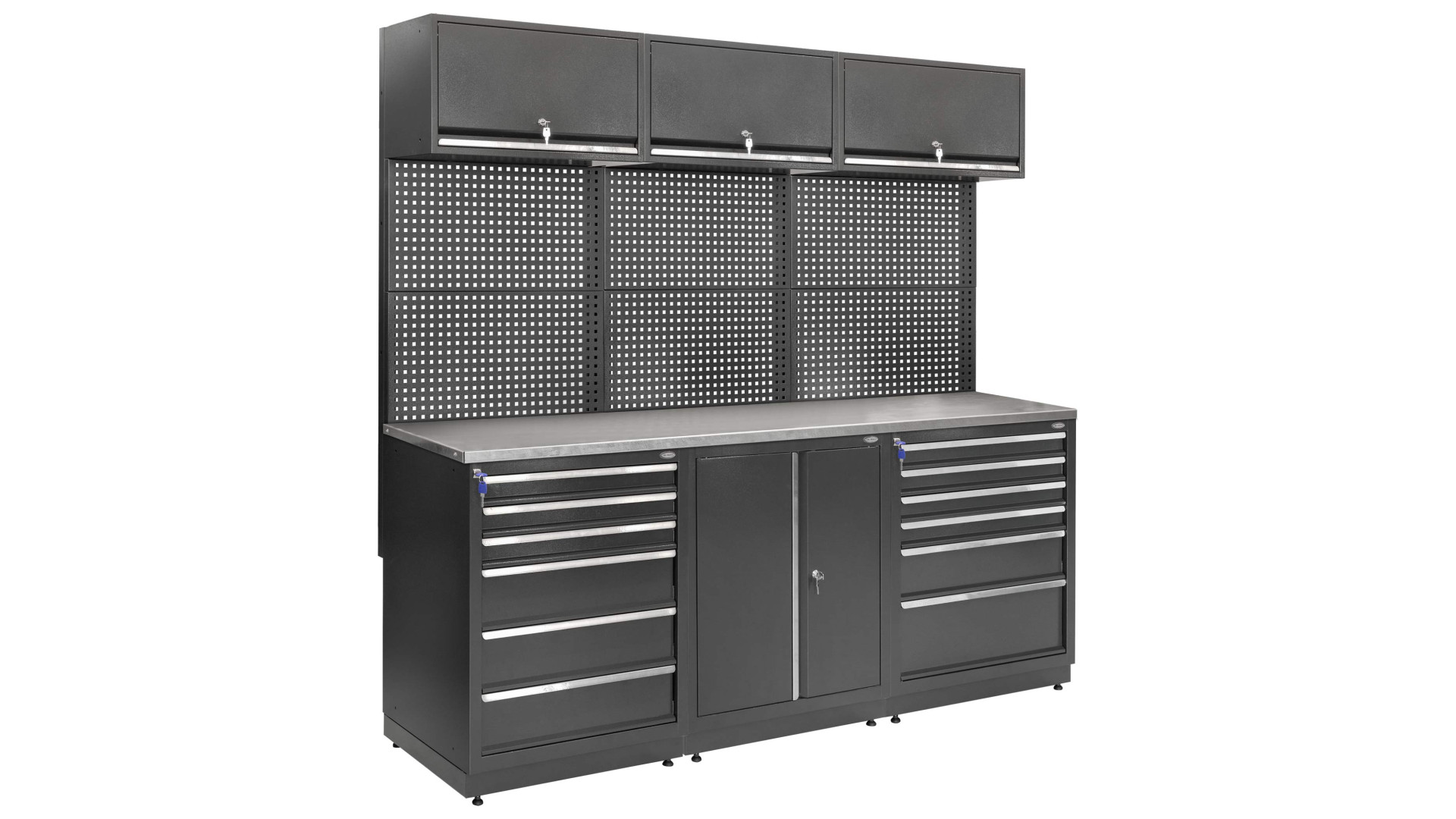 Система MODUL Л-03-007 - это линейный комплекс для организации рабочего пространства в мастерских и производственных помещениях. Конструкция сочетает три модуля с выдвижными ящиками и столешницу длиной 2025 мм. Система обеспечивает упорядоченное хранение инструментов и расходных материалов и создает удобную поверхность для выполнения работ.