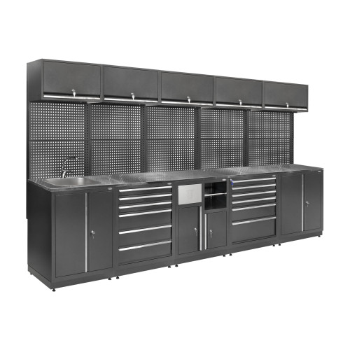 Система MODUL Л-05-001 - это комплекс мебели для организации рабочего места, включающий шкаф, несколько блоков с выдвижными ящиками, столешницу и панели для инструментов. Конструкция используется в производственных помещениях и мастерских, где необходимо упорядочить инструменты, обеспечить хранение расходных материалов и получить просторную рабочую поверхность. Система формирует единый модуль с возможностью адаптации под нужды пользователя.