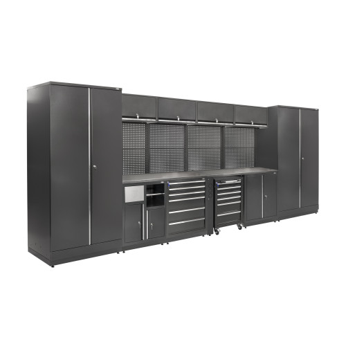 Система MODUL Л-06-003 - это комплекс мебели для производственных и мастерских помещений, который включает стационарные шкафы, блоки с выдвижными ящиками и дополнительно оснащен мобильным модулем и блоком с урной. Такая конструкция обеспечивает не только организованное хранение инструментов и материалов, но и создает рабочее место с возможностью быстрой адаптации под различные задачи.