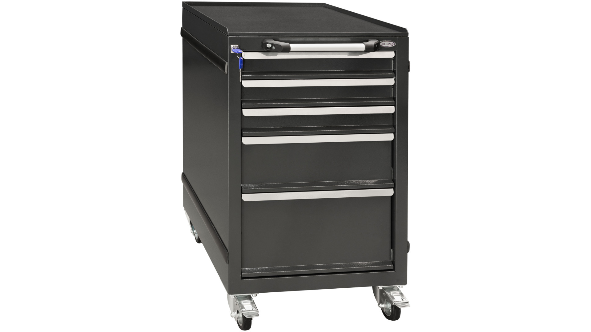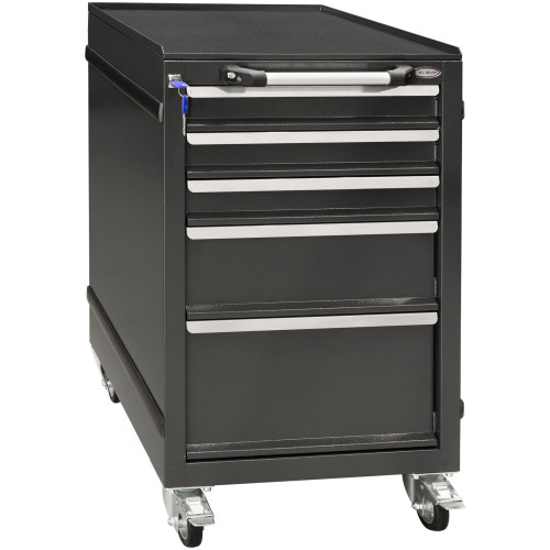 Габариты изделия составляют 500х840х650 мм (ШхВхГ). Модель изготовлена из металла и окрашена порошковой краской в оттенке RAL7016 (антрацитово-серый), которая защищает поверхность от коррозии и воздействия влаги. Конструкция имеет вес 56 кг и оборудована телескопическими направляющими полного выдвижения с доводчиком, обеспечивающими плавный ход ящиков и легкий доступ к инструментам и деталям. Допустимая нагрузка на каждый ящик - 40 кг