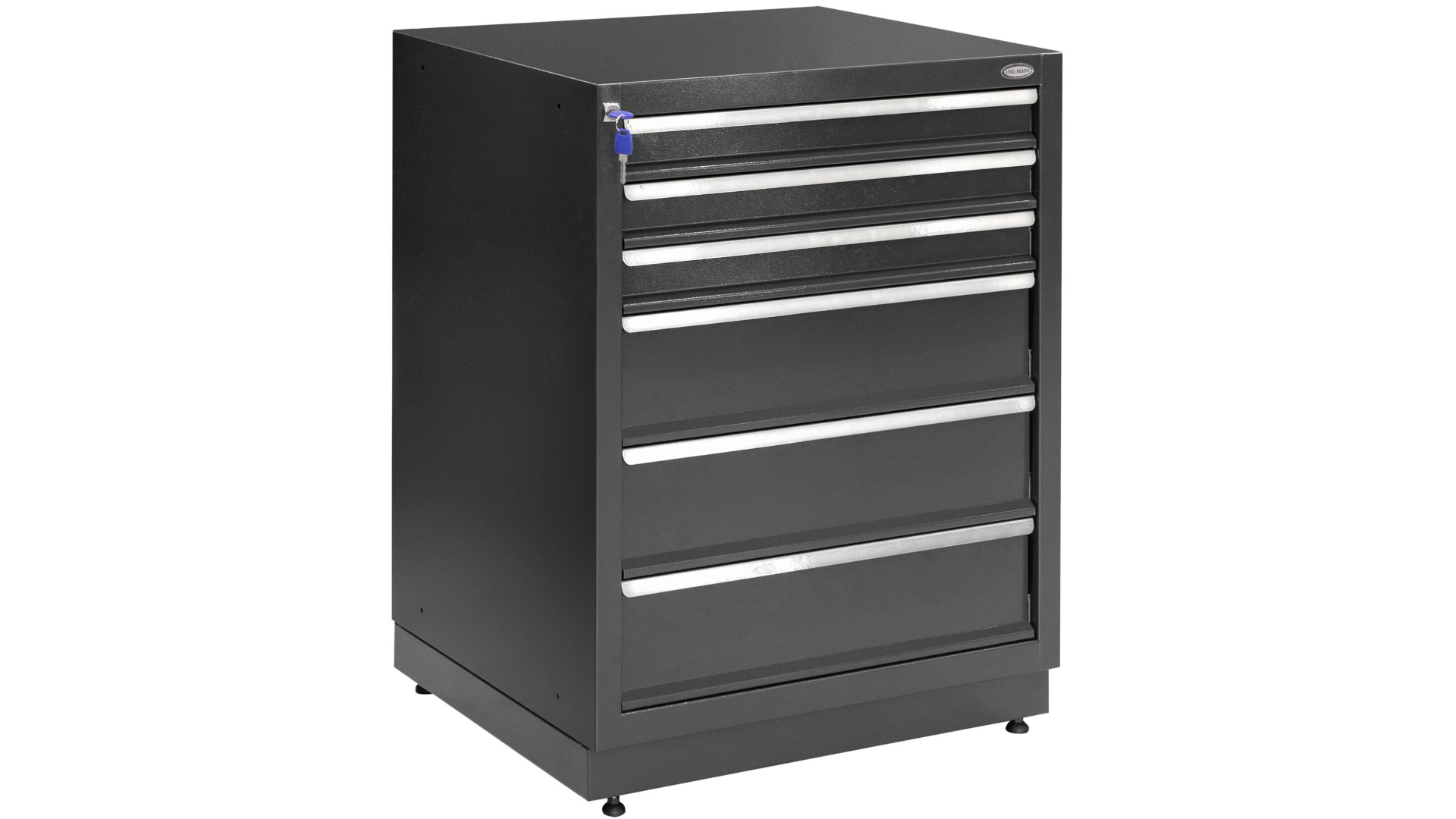Габариты изделия составляют 675х870х600 мм (ШхВхГ). Металлические поверхности покрыты порошковой краской RAL7016 (антрацитово-серый), что повышает защиту от влаги, коррозии. Тумба оборудована телескопическими направляющими полного выдвижения с доводчиком, которые обеспечивают плавность хода ящиков. Допустимая нагрузка на каждый ящик - 40 кг.