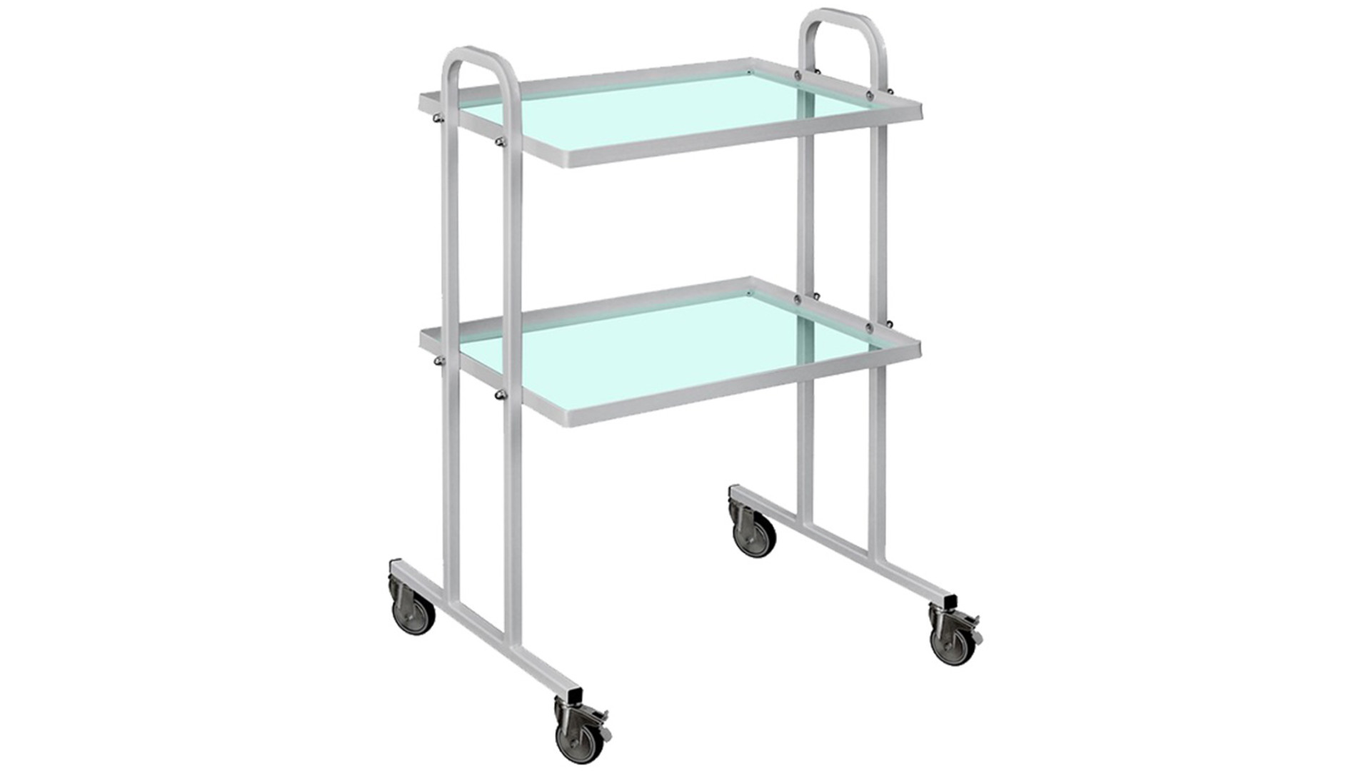 Модель имеет разборной металлический каркас из стальной профильной трубы 20×20 мм. Для размещения инструментов предусмотрены две стеклянные полки толщиной 4 мм. Вертикальные стойки с рамками-полицетримачами повышают жесткость конструкции и обеспечивают надежную фиксацию полок. Стол оборудован четырьмя самопозиционными колесами диаметром 100 мм, два из которых имеют тормоза для фиксации во время работы. Выступающие части стоек выполняют функцию ручек, что облегчает транспортировку. Поверхность окрашена белой порошковой краской RAL с антибактериальными свойствами, устойчивой к действию дезинфицирующих средств.