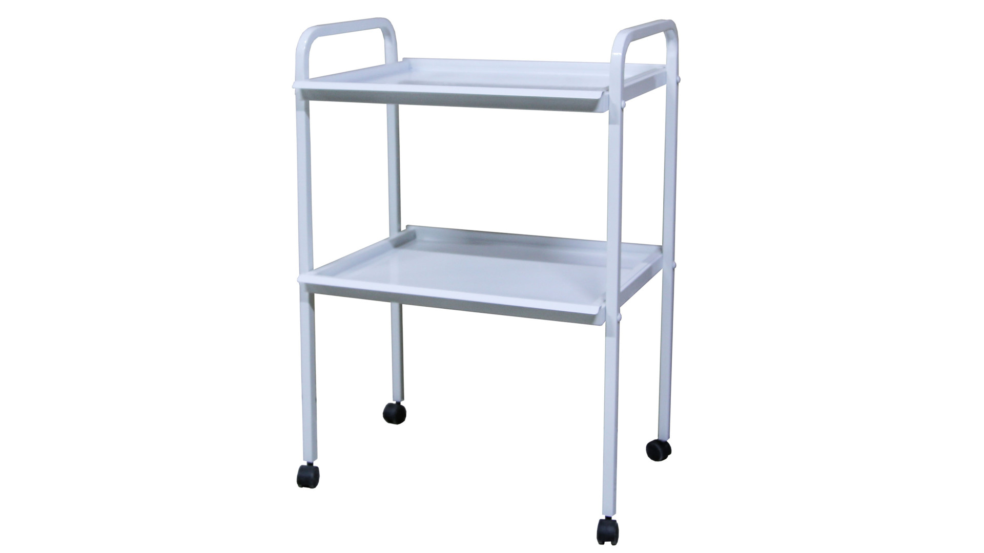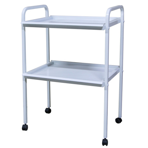 Стол имеет разборной металлический каркас из стальной профильной трубы 20×20 мм. Для размещения инструментов предусмотрены две металлические полки, которые легко очищаются и выдерживают интенсивную эксплуатацию. Вертикальные стойки с рамками повышают жесткость конструкции. Опора оборудована четырьмя самопозиционными колесами Ø40 мм, которые обеспечивают мобильность и стабильность при перемещении. Выступающие стойки выполняют функцию ручек для транспортировки. Поверхность покрыта порошковой краской белого цвета RAL с антибактериальными свойствами, устойчивой к действию дезинфицирующих средств.