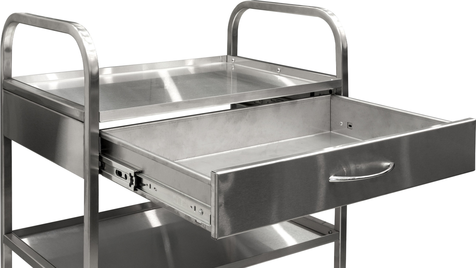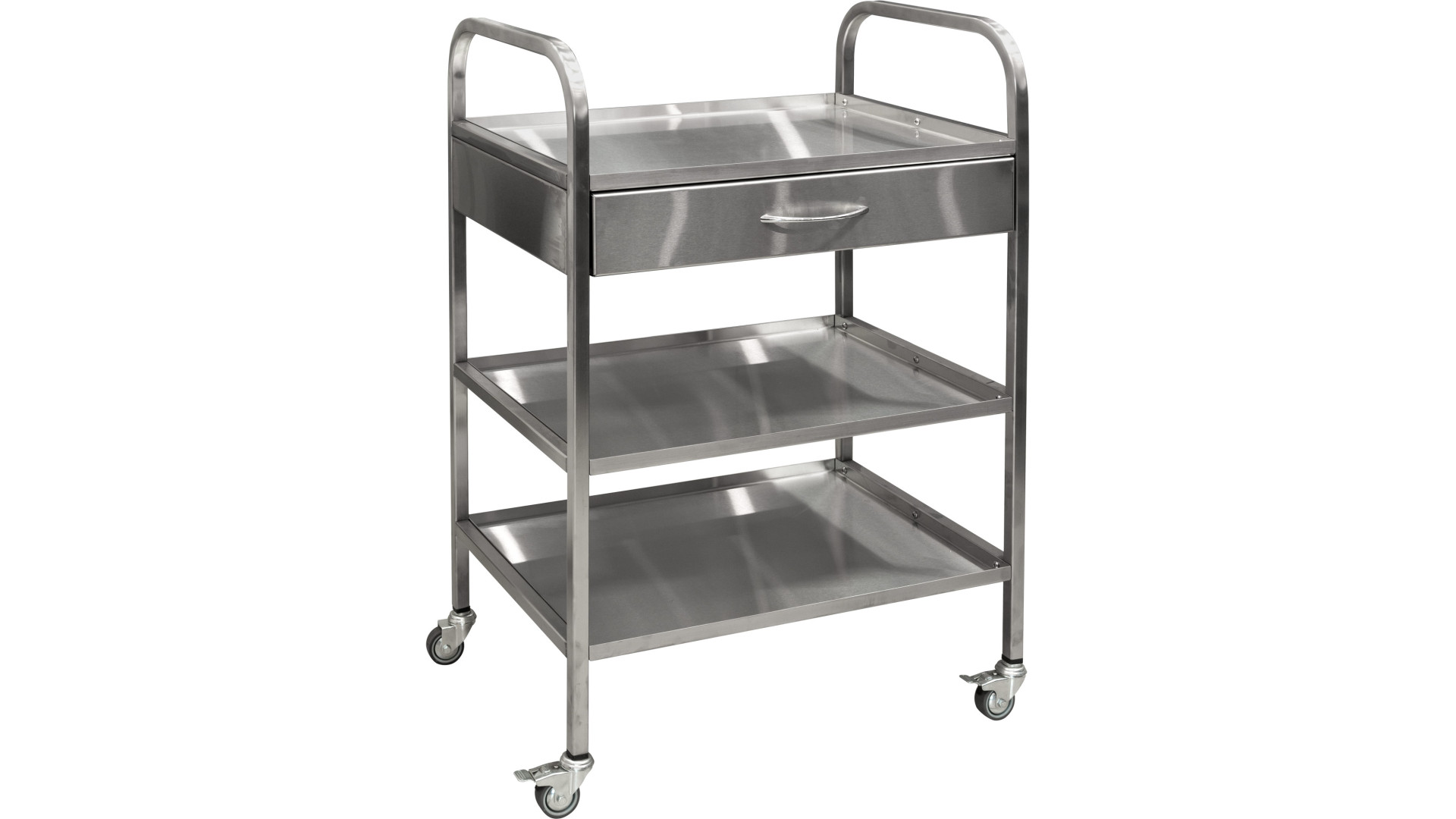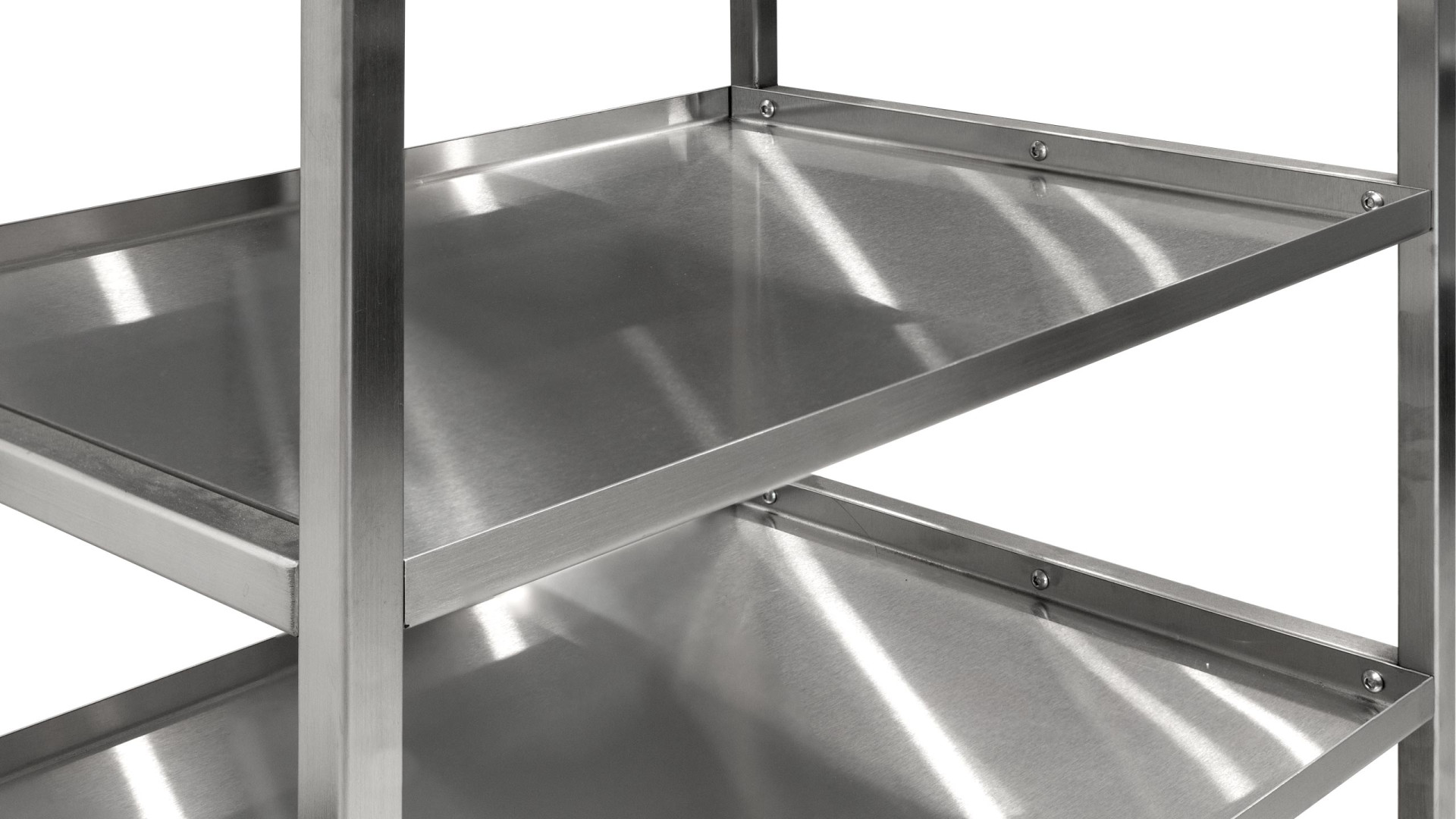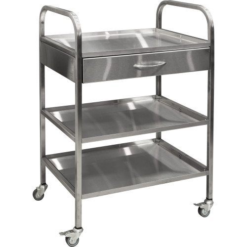 Модель имеет три полки и один выдвижной ящик, расположенный под верхней полкой. Все элементы изготовлены из нержавеющей стали AISI 304, которая характеризуется повышенной химической стойкостью и пригодностью для медицинских условий. Гладко отполированные поверхности легко очищаются, не задерживают грязь и обладают естественными антибактериальными свойствами. Прочный каркас гарантирует стабильность во время эксплуатации и длительный срок службы изделия.