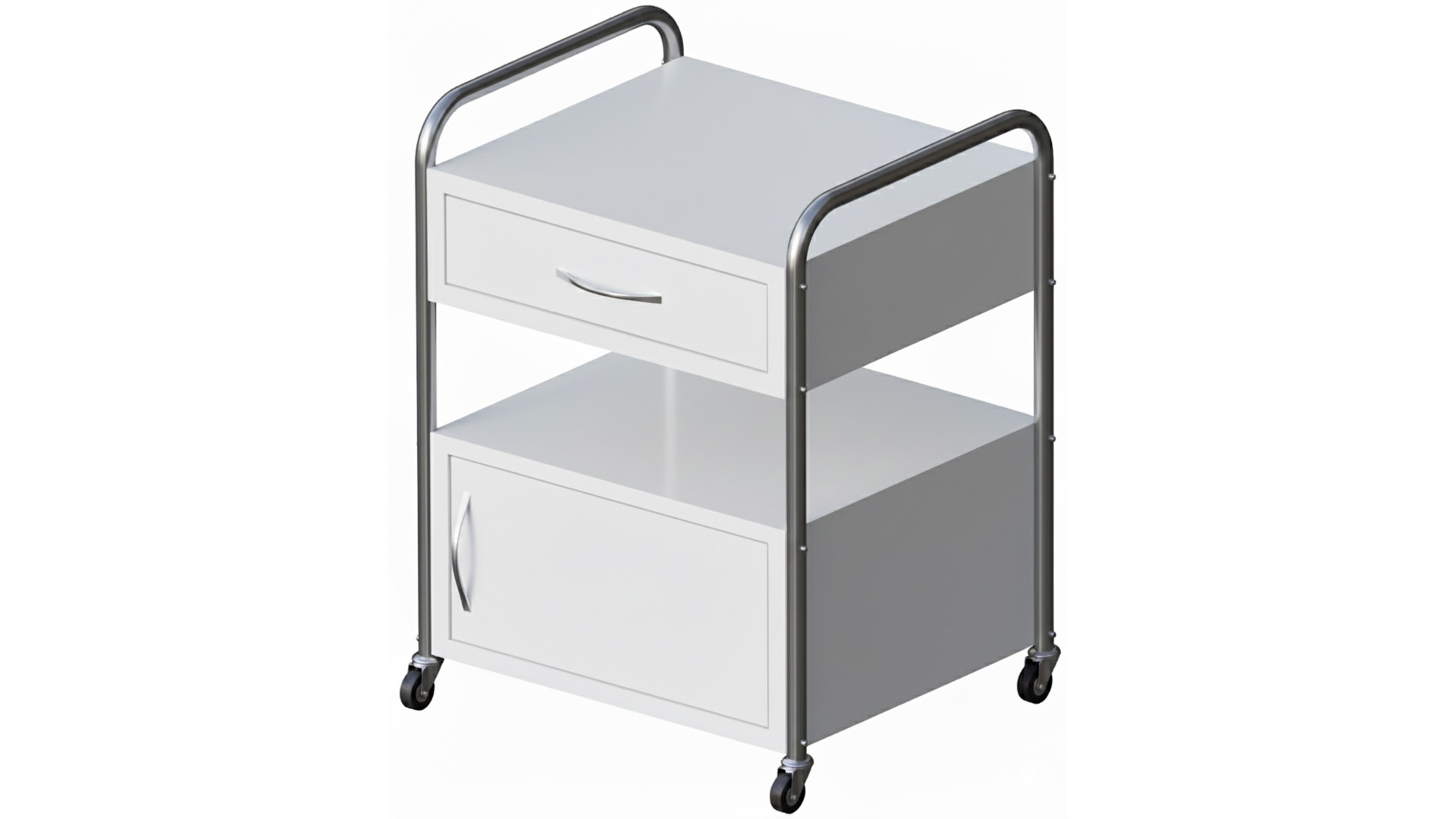 Модель имеет прочный металлический корпус, покрытый порошковой краской RAL 7035, устойчивой к влаге, царапинам и действию дезинфицирующих средств. Внутри расположено одно отделение с выдвижным ящиком, дверной секцией и двумя полками для упорядоченного хранения инструментов и материалов. Для мобильности тумба оснащена четырьмя колесами с возможностью фиксации, обеспечивающими плавное и безопасное перемещение даже в узких пространствах, например возле кровати пациента. Компактные размеры позволяют удобно размещать тумбу рядом с рабочим местом. Изделие поставляется в собранном виде в картонной упаковке.