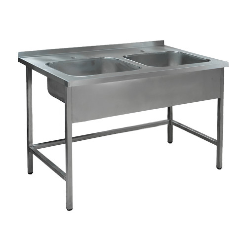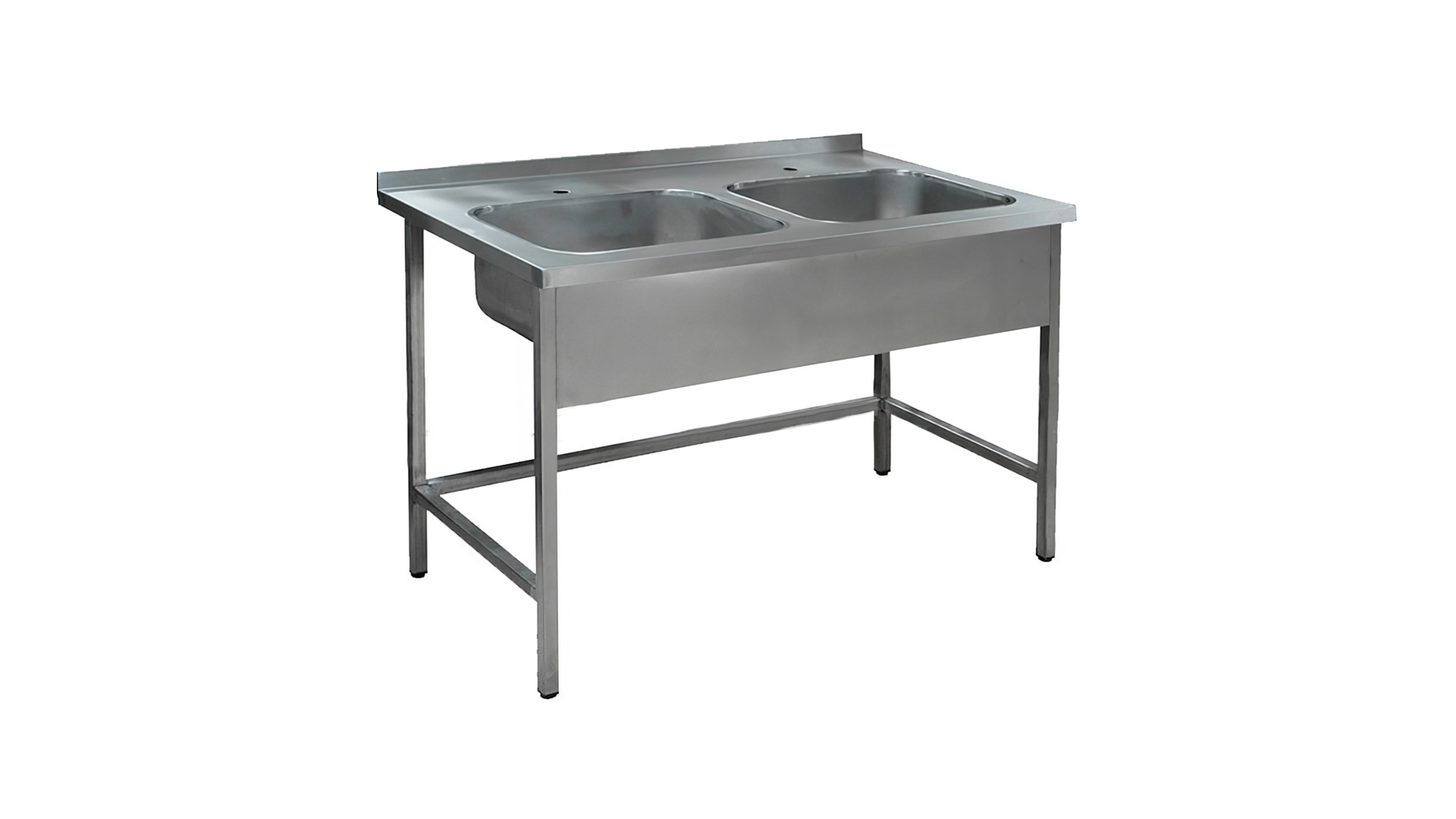 Чаши выполнены методом глубокой вытяжки из цельного листа стали. Отсутствие швов в рабочей зоне облегчает ежедневную очистку и снижает вероятность накопления загрязнений. Опорная рама изготовлена из профильной трубы с жесткими перемычками, что гарантирует стабильность мойки. Регулируемые ножки помогают компенсировать неровности пола. Задний борт предотвращает попадание жидкости на стену во время эксплуатации. Модель поставляется в собранном виде и дополнительно защищена картоном и стрейч-пленкой во время транспортировки.