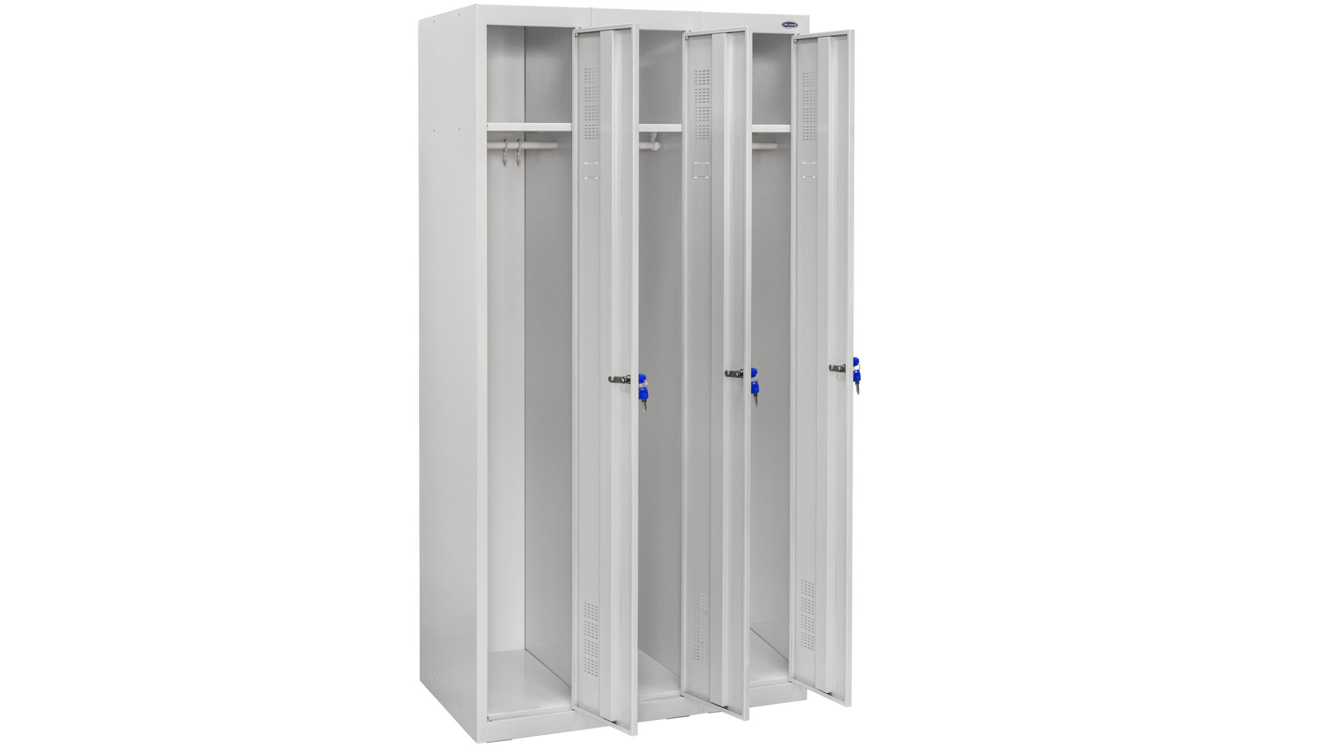 Металлические шкафы для раздевалок рассчитаны на использование большим количеством людей, поэтому изготавливаются из листовой стали. Это повышает устойчивость конструкции к механическим нагрузкам и износу. Модель ШОМ-300/3 имеет три секции с отдельными дверцами, усиленными ребрами жесткости. Это предотвращает деформацию и продлевает срок эксплуатации. Запирание осуществляется с помощью флажкового механизма, возможна установка кодового, навесного или бесконтактного замка.