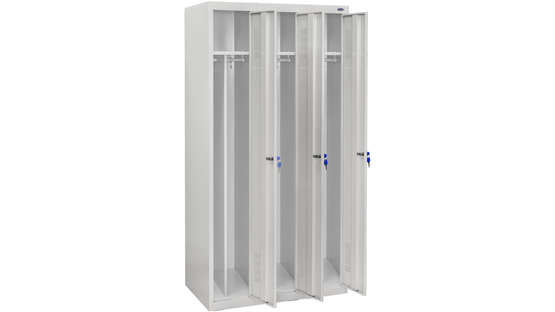 Металлические шкафы для раздевалок рассчитаны на использование большим количеством людей, поэтому изготавливаются из листовой стали. Это повышает устойчивость конструкции к механическим нагрузкам и износу. Модель ШОМ-300/3 вик.01 имеет три секции с отдельными дверцами, усиленными ребрами жесткости. Это предотвращает деформацию и продлевает срок эксплуатации. Запирание осуществляется с помощью флажкового механизма, возможна установка кодового, навесного или бесконтактного замка.