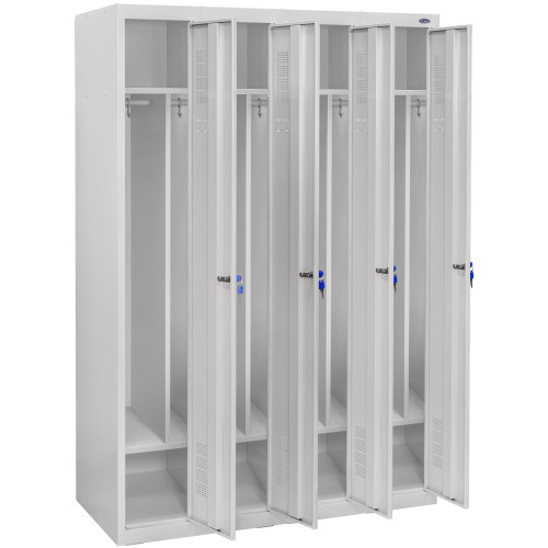 Шкаф изготовлен из листовой стали, что обеспечивает его высокую прочность и износостойкость. Конструкция состоит из четырех секций, каждая из которых оснащена отдельной дверцей. Усиленные ребра жесткости предотвращают деформацию, сохраняя геометрию шкафа даже при интенсивном использовании. Для защиты содержимого предусмотрено запирание на ключевой флажковый механизм. Дополнительно можно установить кодовый или электронный замок.