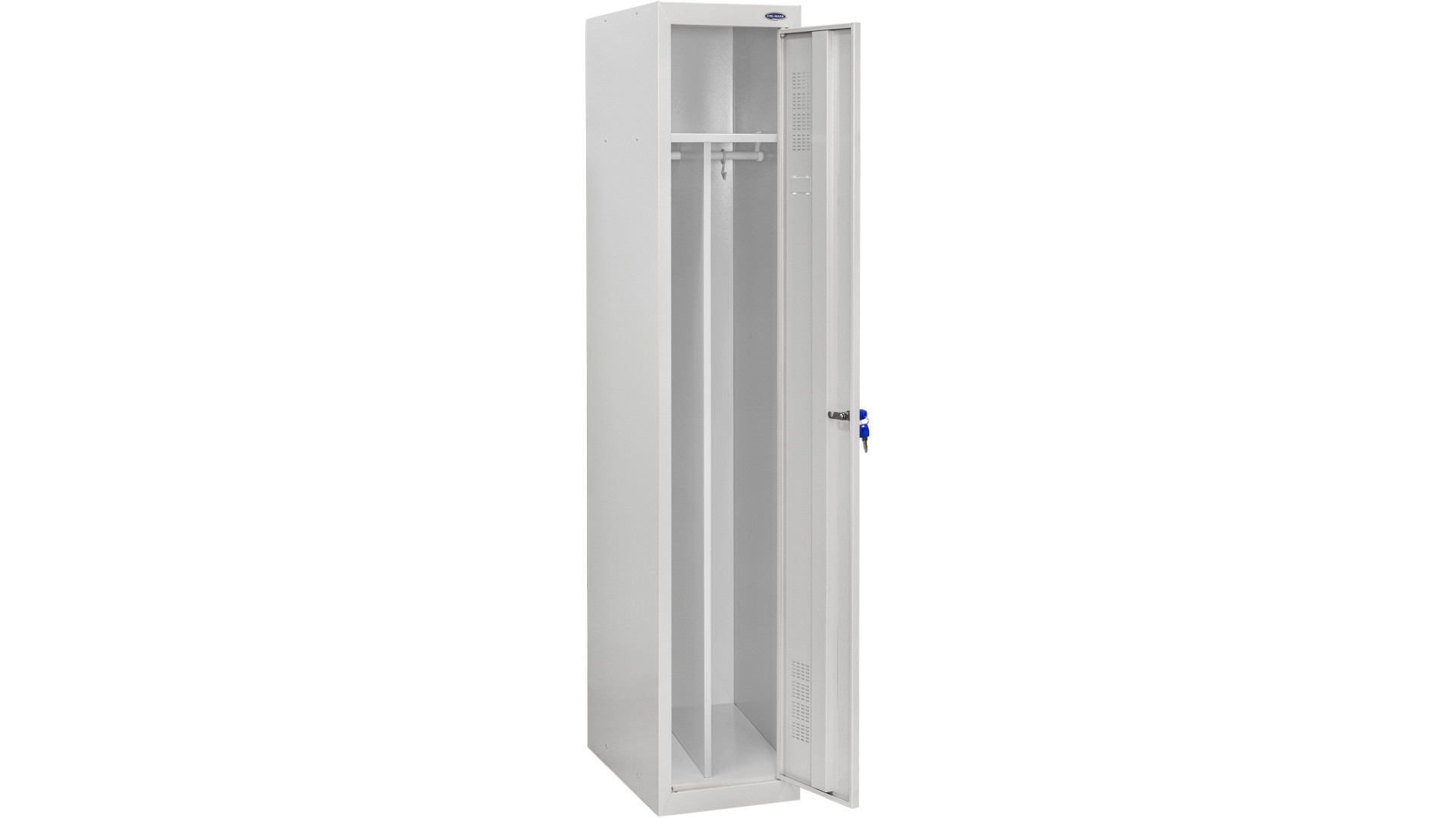 Дверь шкафа ШОМ-400/1 вик.01 оснащена желобом жесткости и двухуровневой перфорацией. Усиление полотна увеличивает стойкость ко взлому и механическим повреждениям. Отверстия обеспечивают постоянную вентиляцию шкафа. Это не дает влаге и неприятным запахам накапливаться внутри конструкции. Наличие цилиндрического замка позволяет безопасно хранить личные вещи. Металлический одежный шкаф оборудован полочкой и перекладиной для вешалок. Такая комплектация позволяет компактно разместить верхнюю одежду и личные вещи. При оформлении заказа, помимо стандартного оснащения шкафа можно приобрести вспомогательную оснастку. Шкафы для одежды в собранном виде скреплены заклепками, а в разобранном — поставляются в упаковке и собираются на зацепах.