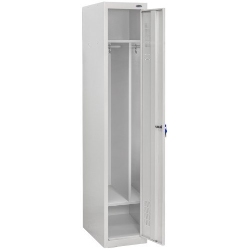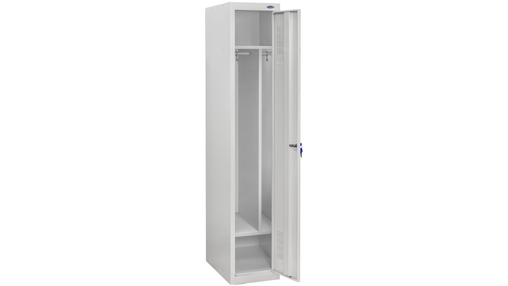 Дверь шкафа ШОМ-400/1 вик.07 оснащена желобом жесткости и двухуровневой перфорацией. Усиление полотна увеличивает стойкость ко взлому и механическим повреждениям. Отверстия обеспечивают постоянную вентиляцию шкафа. Это не дает влаге и неприятным запахам накапливаться внутри конструкции. Наличие цилиндрического замка позволяет безопасно хранить личные вещи. Металлический одежный шкаф оборудован полочкой и перекладиной для вешалок. Такая комплектация позволяет компактно разместить верхнюю одежду и личные вещи. При оформлении заказа, помимо стандартного оснащения шкафа можно приобрести вспомогательную оснастку. Шкафы для одежды в собранном виде скреплены заклепками, а в разобранном — поставляются в упаковке и собираются на зацепах.