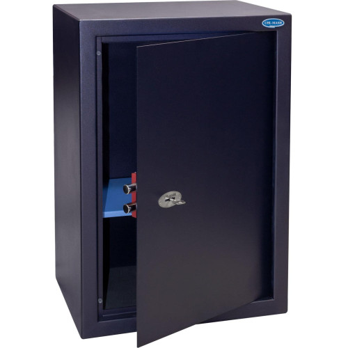 Сейф имеет внешние размеры: ширина 410 мм, высота 550 мм и глубина 370 мм, а его вес составляет 24 кг. Внутренние размеры включают 400 мм по ширине, 340 мм по высоте и 540 мм по глубине, что обеспечивает удобное размещение документов стандартного формата и других предметов. Модель оснащена ключевым механическим замком, который прост и надежен в использовании. Внутри предусмотрена одна металлическая полка для организации пространства. Дверца выполнена из металла толщиной 3 мм, корпус — 2 мм, что обеспечивает защиту от внешних повреждений. Внутреннее расположение петель затрудняет несанкционированный доступ. Конструкция не предусматривает трейзер, что позволяет использовать весь внутренний объем для хранения.