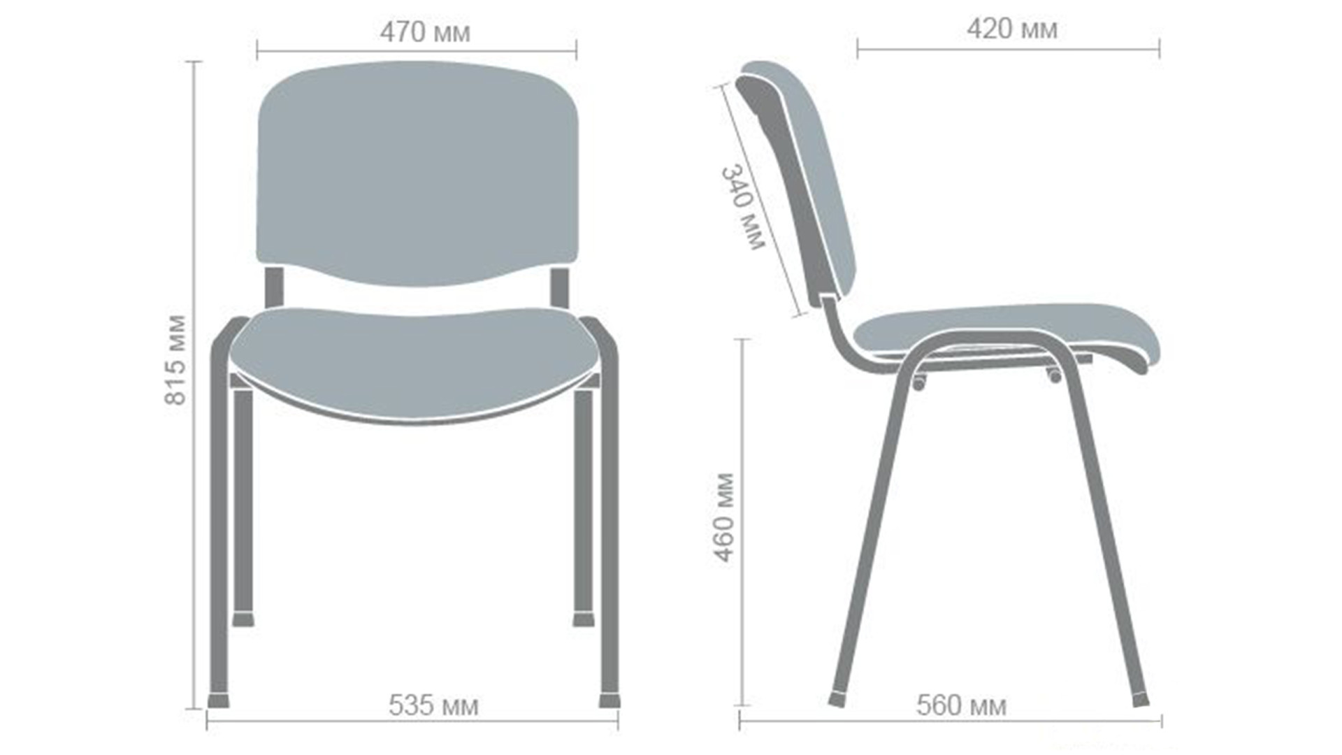 Прочная основа стула изготовлена из металлической трубы, покрытой порошковой краской черного цвета. Такое покрытие защищает металл от коррозии, сколов и царапин. Габариты модели составляют 815х535х560 мм, а вес – 5 кг, что обеспечивает легкость перемещения мебели. Конструкция рамы позволяет штабелировать стулья (складывать один в один), что экономит пространство при хранении или транспортировке. Ножки оснащены пластиковыми заглушками, которые предотвращают повреждение напольного покрытия.