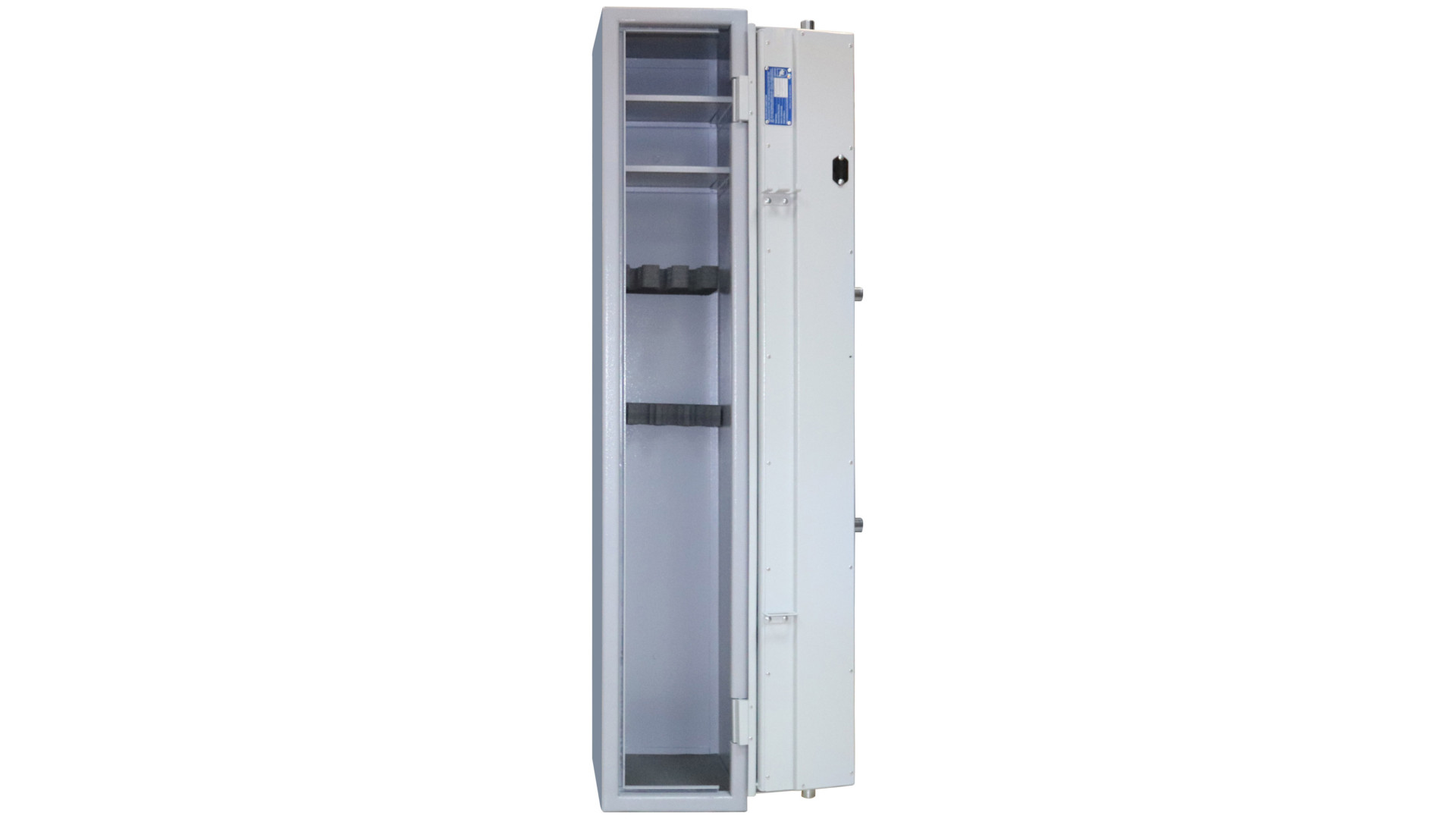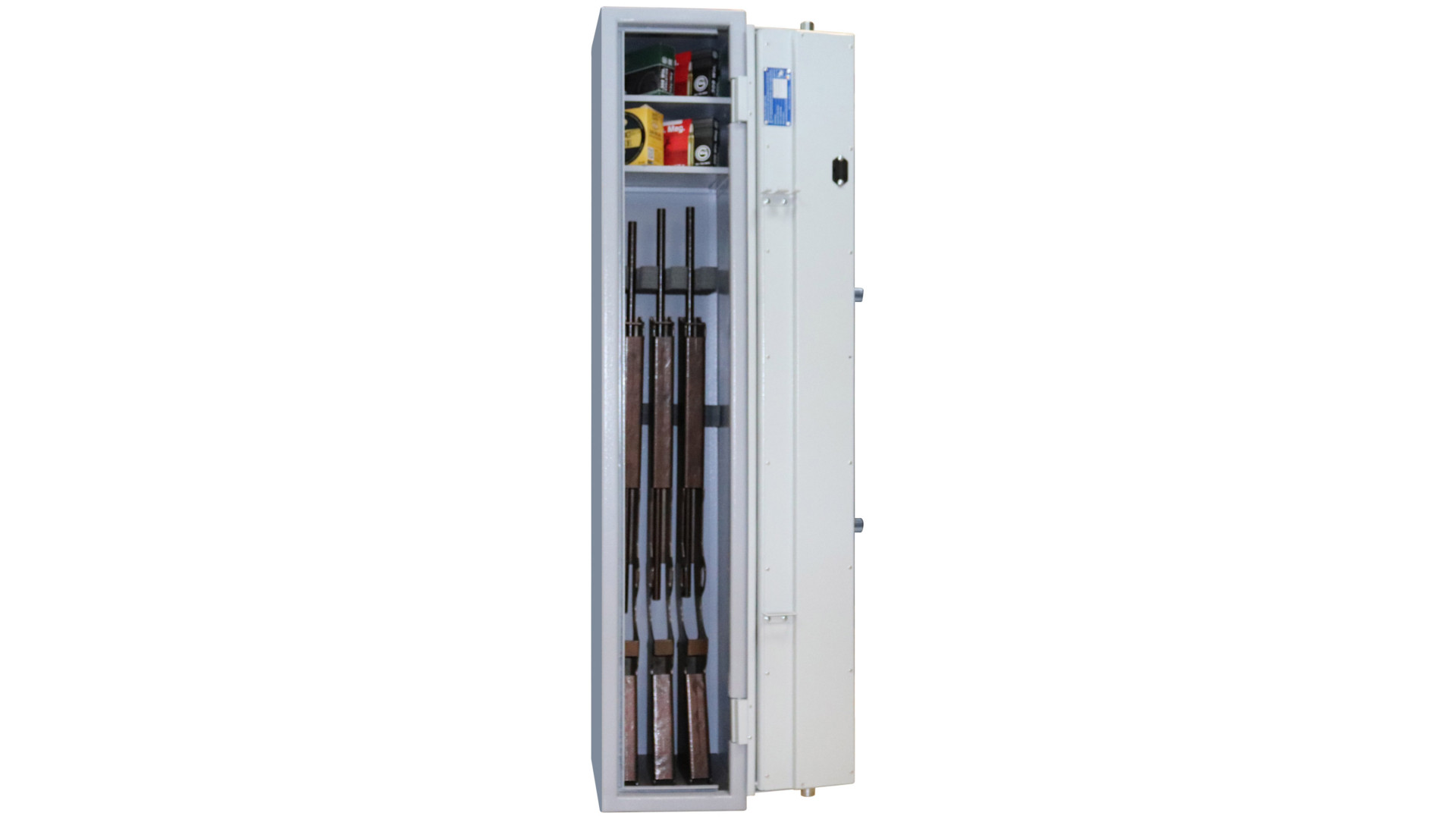 Система запирания основана на ключевом сейфовом замке STUV (Германия), сертифицированном по VDS 1, что подтверждает его надежность. Внутреннее пространство организовано с помощью двух полок, которые позволяют хранить боеприпасы, документы и аксессуары. Для дополнительной безопасности предусмотрены анкерные узлы, с помощью которых сейф можно закрепить к стене. Габариты сейфа – 1400×250×300 мм, объем – 76,5 литра. Цвет исполнения – серый (RAL 7035, RAL 7040), что обеспечивает нейтральный внешний вид.
