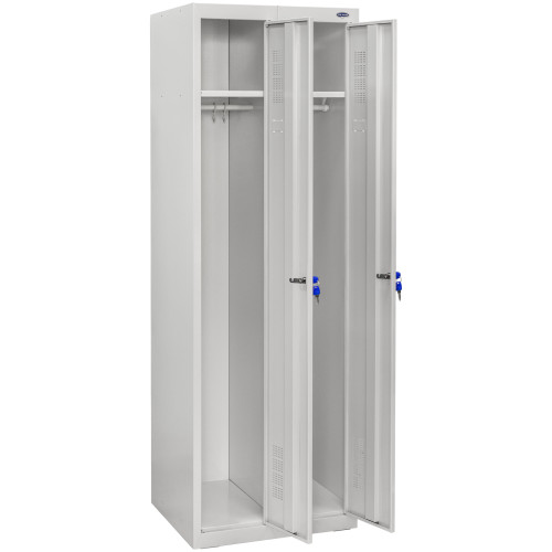 Менеджер поможет подобрать оптимальный тип сборки при оформлении заказа. Ячейки оборудованы скобой под вешалки. Это поможет комфортно хранить верхнюю одежду. Полочка и крючок позволят компактно разместить личные вещи в шкафчике. Перфорированная дверь одежного шкафа ШОМ-300/2 обеспечивает вентилирование содержимого. Это препятствует скоплению неприятных запахов и влаги. Конструкция окрашивается полимерно-порошковой краской светло-серого цвета. Фосфатирование корпуса защищает шкаф от коррозии. Краска не содержит токсичных компонентов. Шкафы можно устанавливать во влажных закрытых пространствах, что делает их универсальными. Покупайте шкафы для одежды ШОМ-300/2 по ценам производителя.