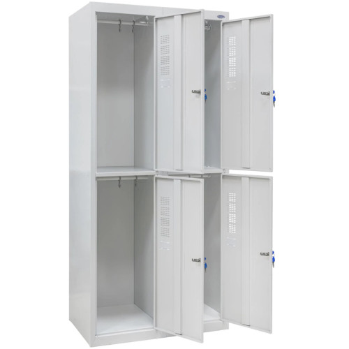 Одежные шкафы оснащены надежными индивидуальными замками. Это позволяет компактно разместить верхнюю одежду без складок. В наличии доступна дополнительная комплектация. Полочки увеличивают функциональность одежных шкафчиков. Держатель для полотенец помогает разместить сухое полотенце и ускоряет его высыхание. Цоколь и ножки повышают устойчивость шкафа к расшатыванию. Наклонная крыша упрощает уход за шкафом. Это облегчает использование шкафчиков большим количеством людей. Шкафы для одежды в собранном виде скреплены заклепками, а в разобранном — поставляются в упаковке и собираются на зацепах.