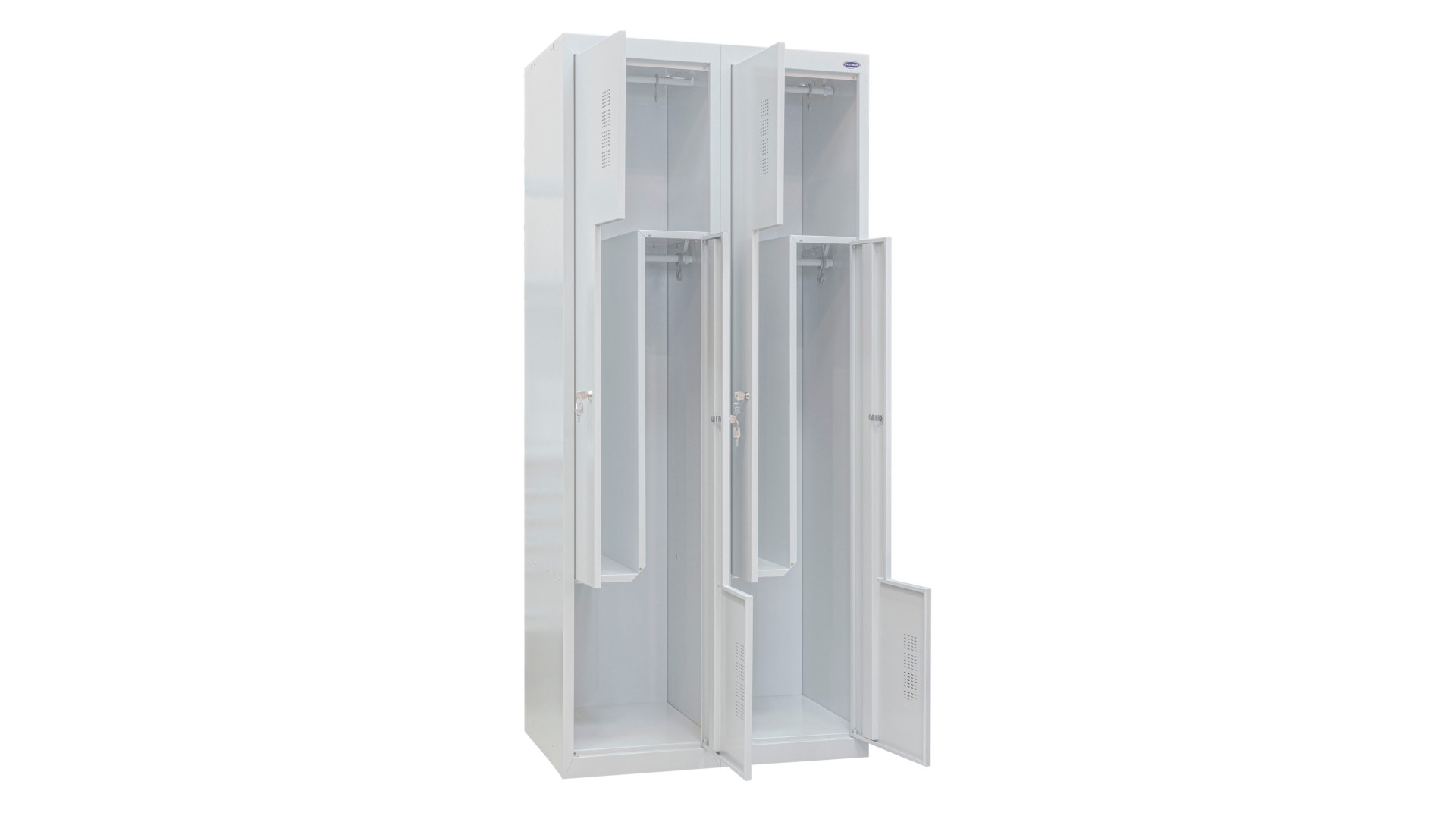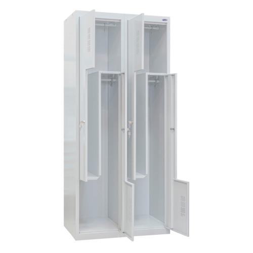 В одной секции организованы 4 Г-образные ячейки. Оригинальное конструктивное решение позволяет хранить разные по габаритам вещи – как верхнюю одежду, так и обувь. Система вентиляции обеспечивает своевременное высыхание вещей, а также отводит неприятные запахи. Верхний держатель с крючком можно использовать как вешалку. Каждая ячейка оснащена замковой фурнитурой производства Euro-locks (Германия)/Emka (Франция). Стенки и дверцы изготовлены из высокопрочной стали, устойчивой к быстрому появлению вмятин. Шкафы для одежды в собранном виде скреплены заклепками.