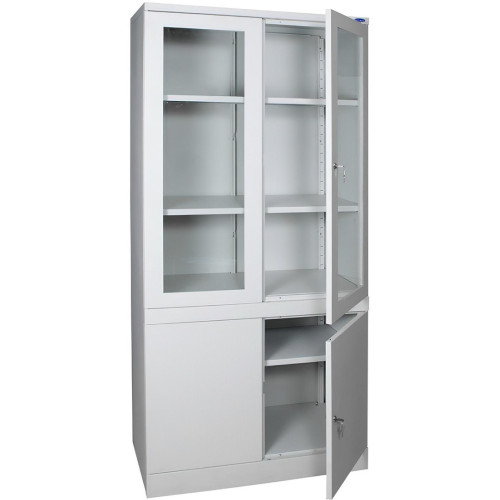 Габариты шкафа - 900×1970×455 мм (ШхВхГ), вес - 77 кг. Модель поставляется в собранном виде, упакована в картон со стрейч-пленкой. Конструкция изготовлена из металла, предварительно обработанного против коррозии и покрытого порошковой краской цвета RAL 7035. Верхний отсек оснащен двустворчатой дверью из закаленного стекла для удобного обзора содержимого. Нижний отсек выполнен цельнометаллическим. Оба отсека оборудованы ключевым ригельным замком для защиты содержимого. Шкаф укомплектован полками с возможностью регулировки высоты. Для комфорта эксплуатации двери оснащены амортизирующими накладками, которые снижают уровень шума во время закрывания.