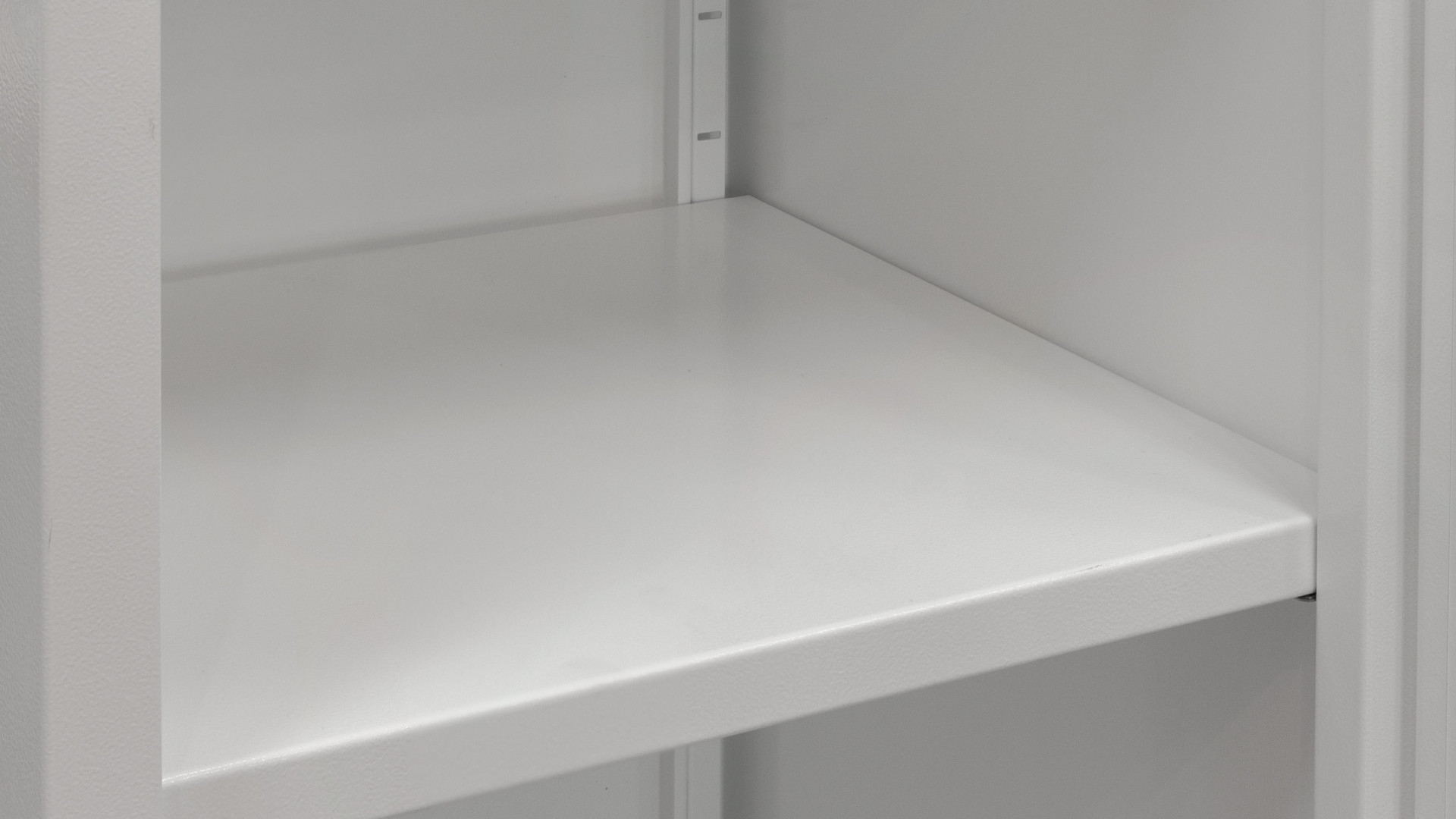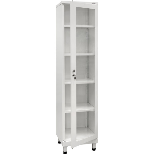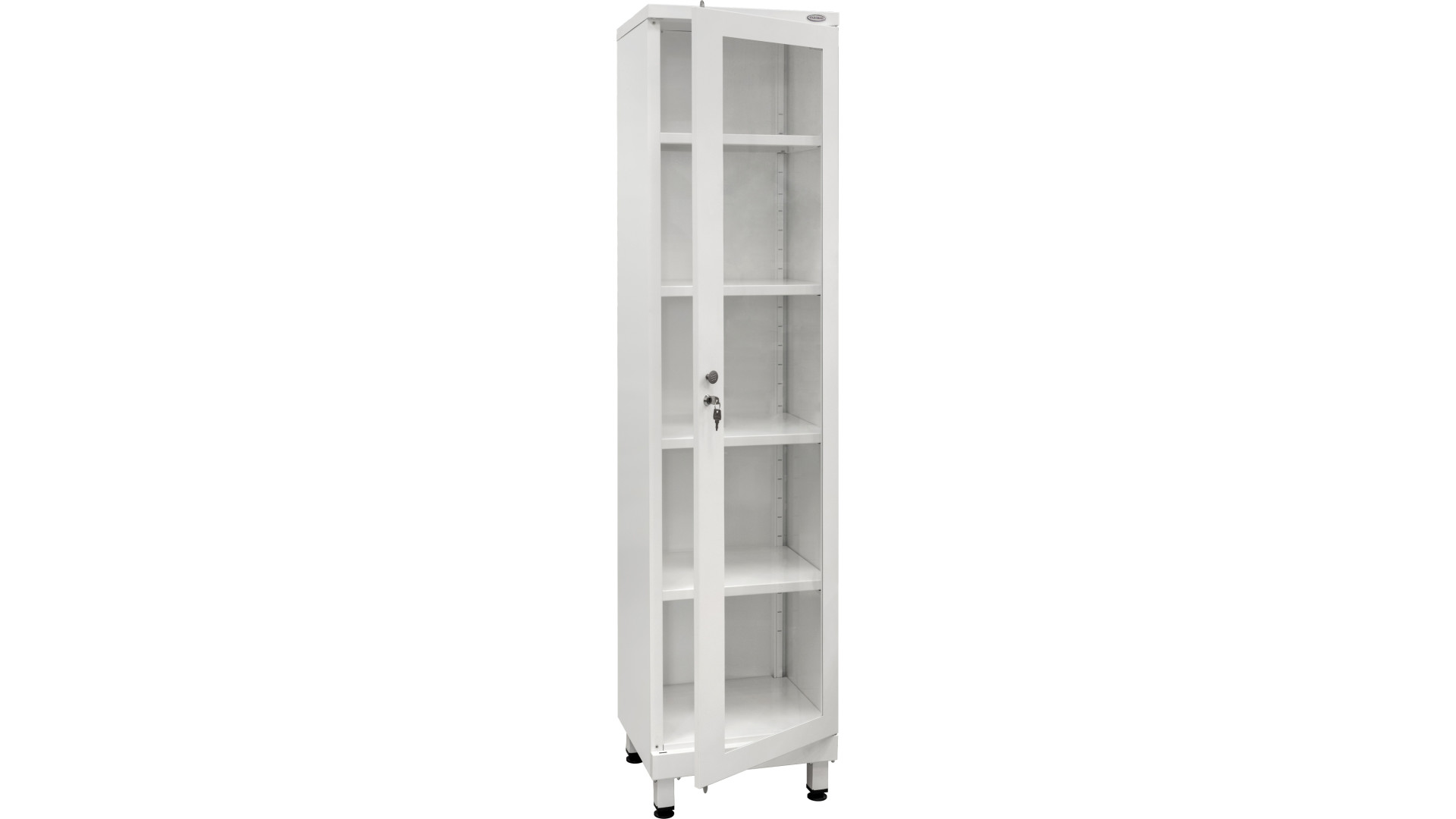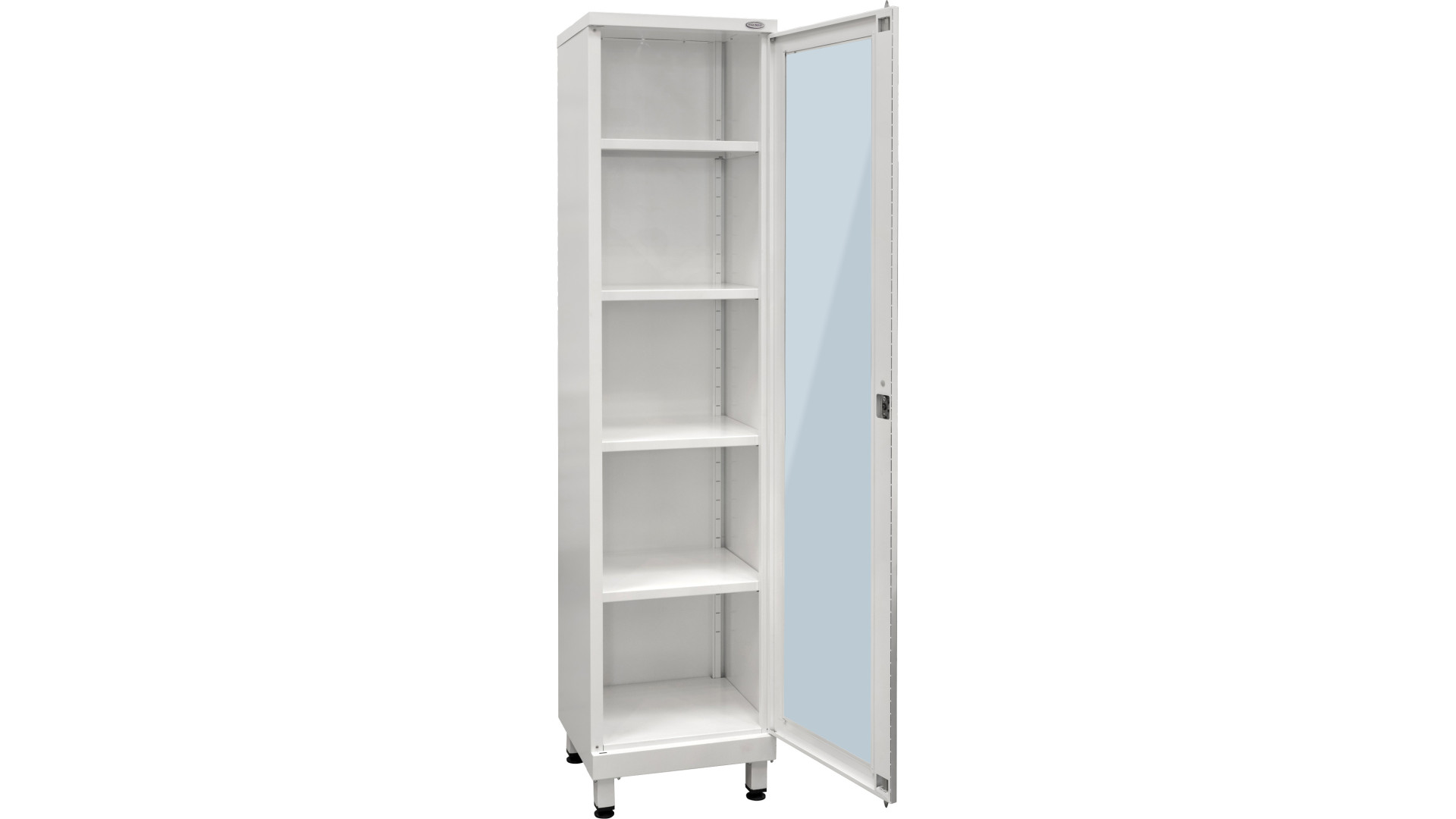 Модель выполнена в виде одностворчатого металлического шкафа с четырьмя полками. Дверь имеет металлическую раму со стеклянной вставкой, которая позволяет осуществлять визуальный контроль без открывания. Для безопасности предусмотрен замок. Ножки оборудованы регулируемыми опорами, что обеспечивает устойчивость на различных поверхностях. Поверхность шкафа покрыта порошковой краской белого цвета RAL с антибактериальными свойствами, которая устойчива к дезинфицирующим средствам и механическому истиранию.