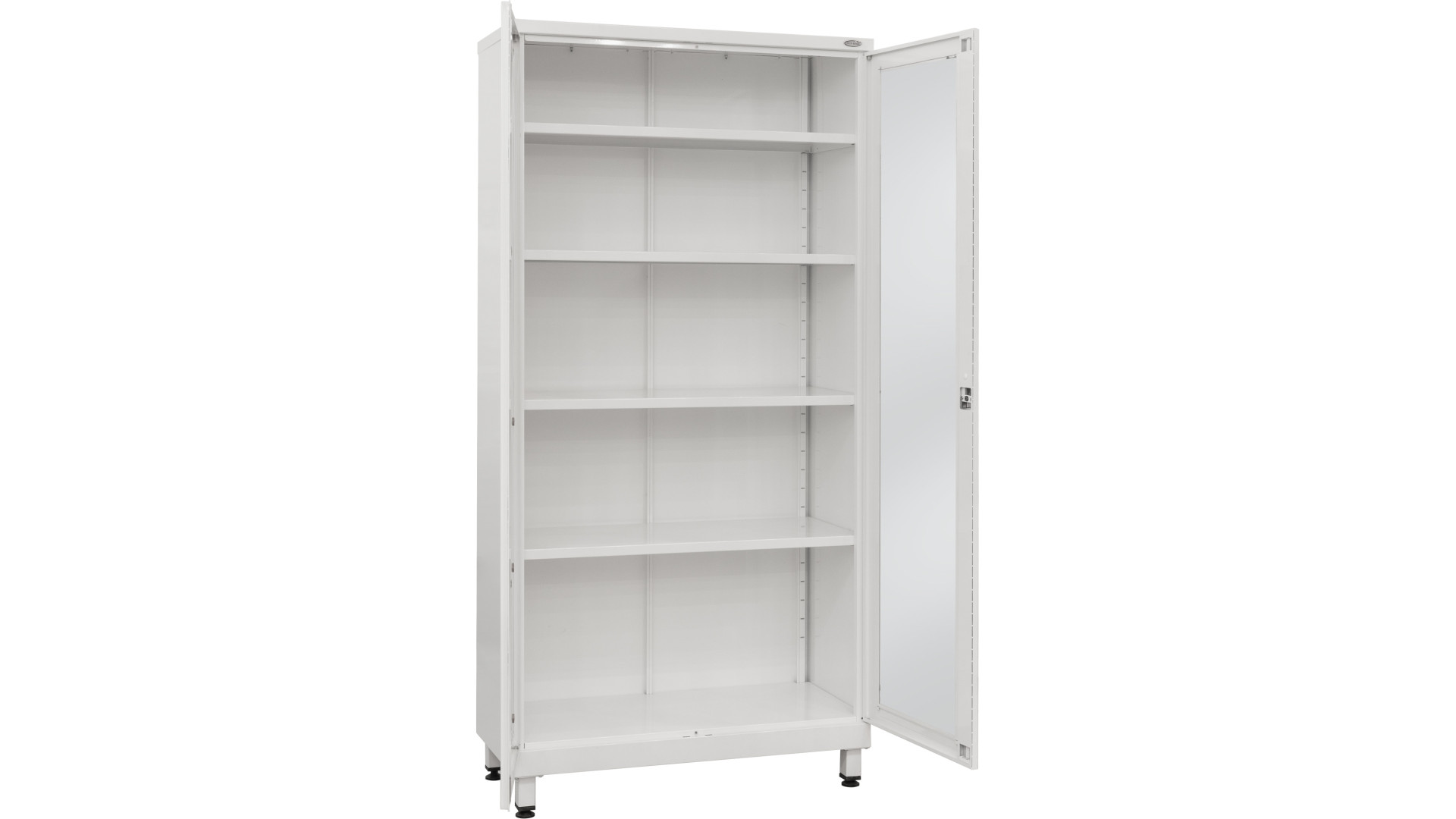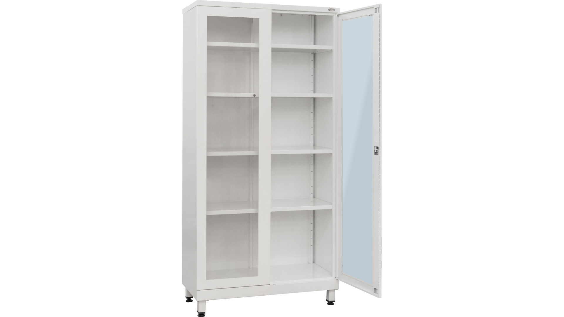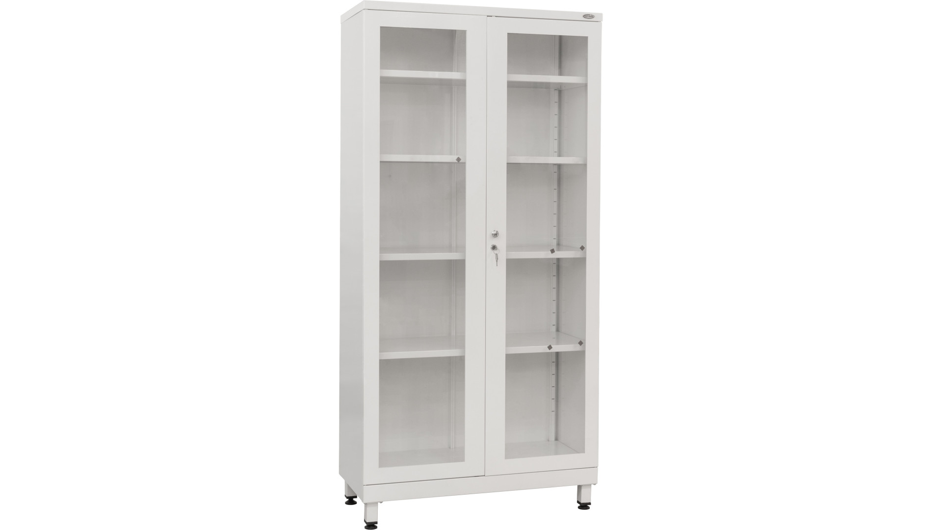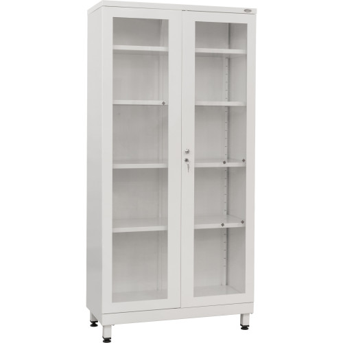 Модель выполнена в виде двустворчатого металлического шкафа с четырьмя вместительными полками. Двери представляют собой металлические рамы со стеклянными вставками, что позволяет контролировать содержимое без открывания. Для безопасного хранения шкаф оборудован замком. Установка на ножки с регулируемыми опорами позволяет выставить стабильное положение даже на неровной поверхности. Поверхность конструкции покрыта порошковой краской белого цвета RAL, которая обладает антибактериальными свойствами и устойчива к действию дезинфицирующих средств