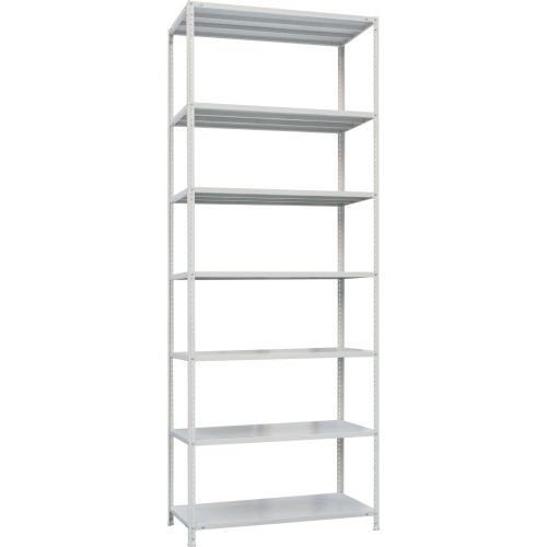 Каркас состоит из стоек цельного типа и стандартных металлических полок. Соединение элементов выполнено винтовым способом. Стеллажи доступны с высотой 2000, 2500 или 3000 мм, шириной 750, 1000 или 1150 мм и глубиной от 300 до 600 мм. Конструкция выдерживает нагрузку до 120 кг, что позволяет размещать грузы средней массы. В процессе производства металл проходит предварительную обработку, после чего наносится порошковая краска. Это покрытие повышает устойчивость к коррозии, царапинам и воздействию влаги. Количество полок указано в таблице технических параметров.