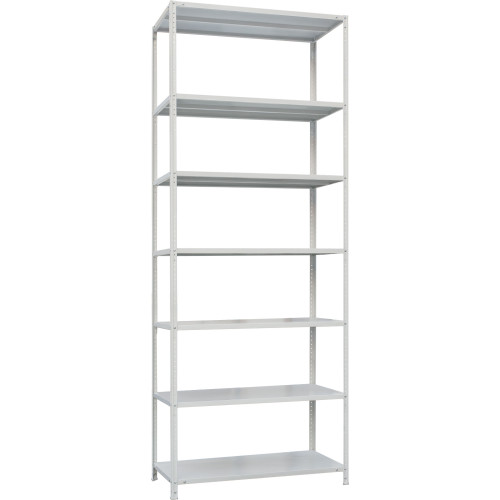 Каркас состоит из стоек цельного типа и стандартных металлических полок. Соединение элементов выполнено винтовым способом. Стеллажи доступны с высотой 2000, 2500 или 3000 мм, шириной 750, 1000 или 1150 мм и глубиной от 300 до 600 мм. Конструкция выдерживает нагрузку до 120 кг, что позволяет размещать грузы средней массы. В процессе производства металл проходит предварительную обработку, после чего наносится порошковая краска. Это покрытие повышает устойчивость к коррозии, царапинам и воздействию влаги. Количество полок указано в таблице технических параметров.