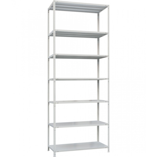Каркас стеллажа состоит из сплошных стоек и металлических полок. Элементы конструкции соединяются с помощью винтовых соединений. Металл обработан и окрашен порошковой краской, которая повышает устойчивость к влаге и царапинам. Доступны модификации с высотой от 1000 до 3000 мм, шириной 900 или 1150 мм и глубиной 460 или 560 мм. Количество полок составляет от 3 до 7 уровней в зависимости от модели. Полки выдерживает общую нагрузку до 200 кг благодаря ребрам жесткости, которыми они усилены.
