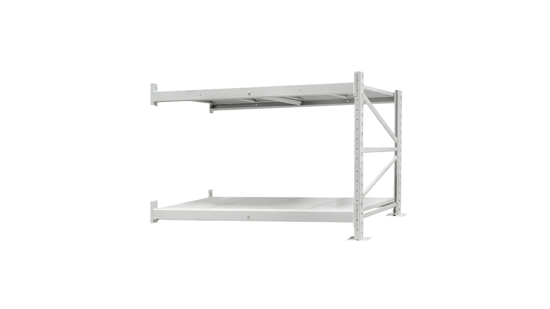Каркас изготовлен из металлического профиля, покрытого порошковой краской, которая защищает конструкцию от влаги, коррозии и механического истирания. Полки выполнены из холоднокатаного листового металла, выдерживающего интенсивную нагрузку. Они устанавливаются на балки со стяжками, которые повышают жесткость и устойчивость конструкции. Приставная секция крепится за к каркасу основной секции, формируя единую металлическую систему, пригодную для эксплуатации в условиях постоянной работы.