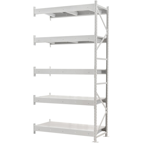Каркас изготовлен из металлического профиля, покрытого порошковой краской, которая защищает конструкцию от влаги, коррозии и механического истирания. Полки выполнены из холоднокатаного листового металла, выдерживающего интенсивную нагрузку. Они устанавливаются на балки со стяжками, которые повышают жесткость и устойчивость конструкции. Приставная секция крепится за к каркасу основной секции, формируя единую металлическую систему, пригодную для эксплуатации в условиях постоянной работы.
