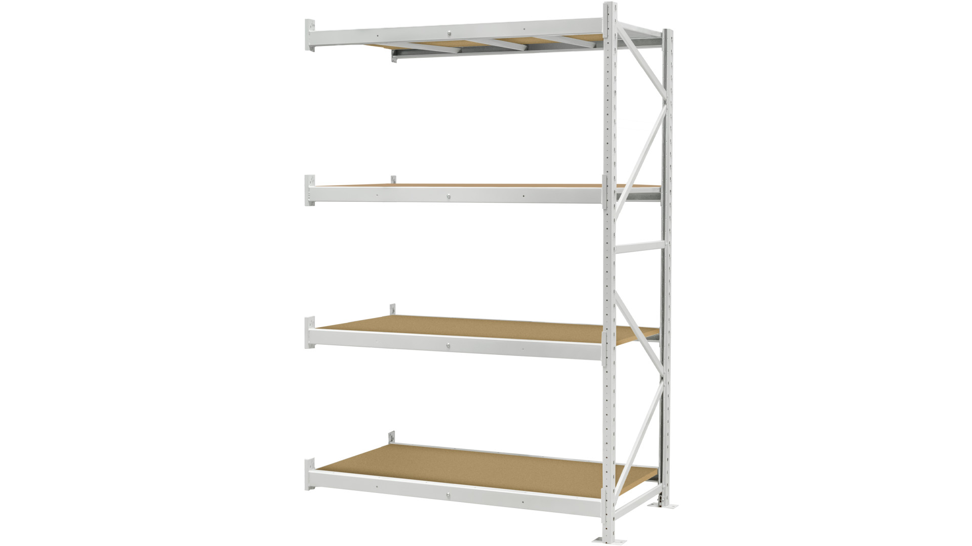 Каркас изготовлен из металла, покрытого порошковой краской, что повышает устойчивость к влаге, коррозии и механическим повреждениям. Полки выполнены из шлифованного ДСП, которое легко очищается и выдерживает ежедневную нагрузку. Они устанавливаются на балки со стяжками, обеспечивающими прочность и стабильность уровней хранения. Приставная секция соединяется с основным стеллажом, образуя единую конструкцию для многоуровневого размещения грузов. Такой тип стеллажей позволяет масштабировать систему хранения без необходимости замены существующих элементов.
