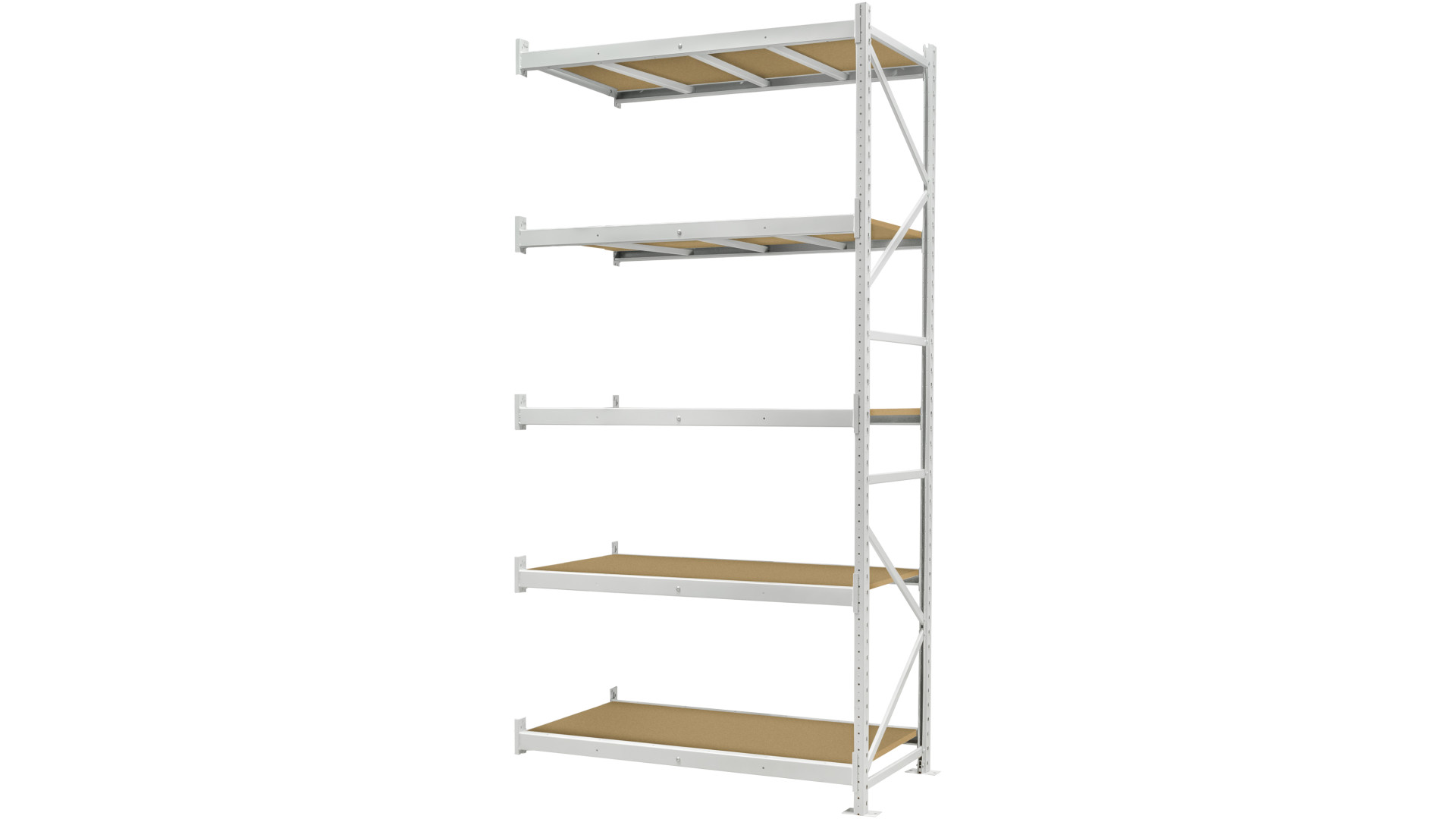 Каркас изготовлен из металла, покрытого порошковой краской, что повышает устойчивость к влаге, коррозии и механическим повреждениям. Полки выполнены из шлифованного ДСП, которое легко очищается и выдерживает ежедневную нагрузку. Они устанавливаются на балки со стяжками, обеспечивающими прочность и стабильность уровней хранения. Приставная секция соединяется с основным стеллажом, образуя единую конструкцию для многоуровневого размещения грузов. Такой тип стеллажей позволяет масштабировать систему хранения без необходимости замены существующих элементов.