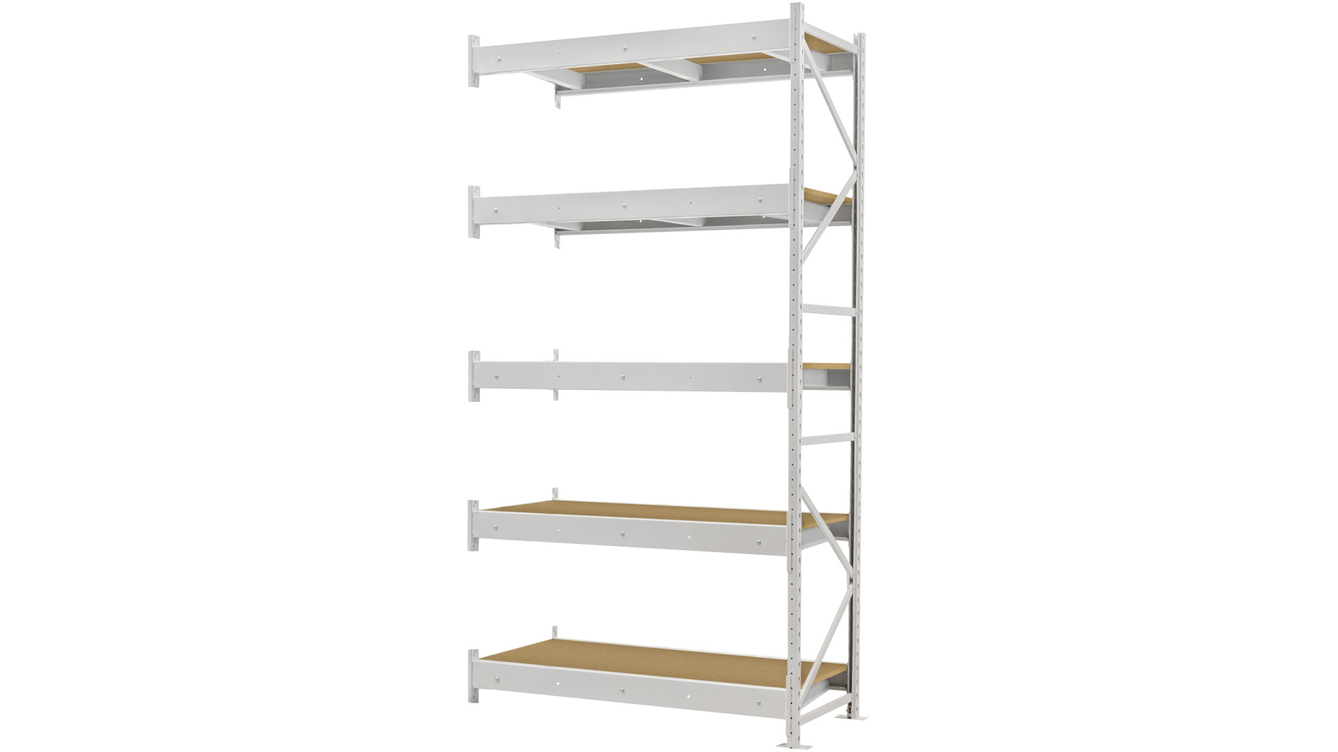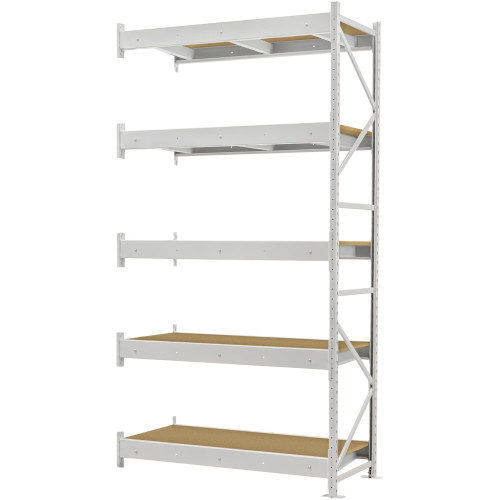 Каркас изготовлен из металла, покрытого порошковой краской, что повышает устойчивость к влаге, коррозии и механическим повреждениям. Полки выполнены из шлифованного ДСП, которое легко очищается и выдерживает ежедневную нагрузку. Они устанавливаются на балки со стяжками, обеспечивающими прочность и стабильность уровней хранения. Приставная секция соединяется с основным стеллажом, образуя единую конструкцию для многоуровневого размещения грузов. Такой тип стеллажей позволяет масштабировать систему хранения без необходимости замены существующих элементов.