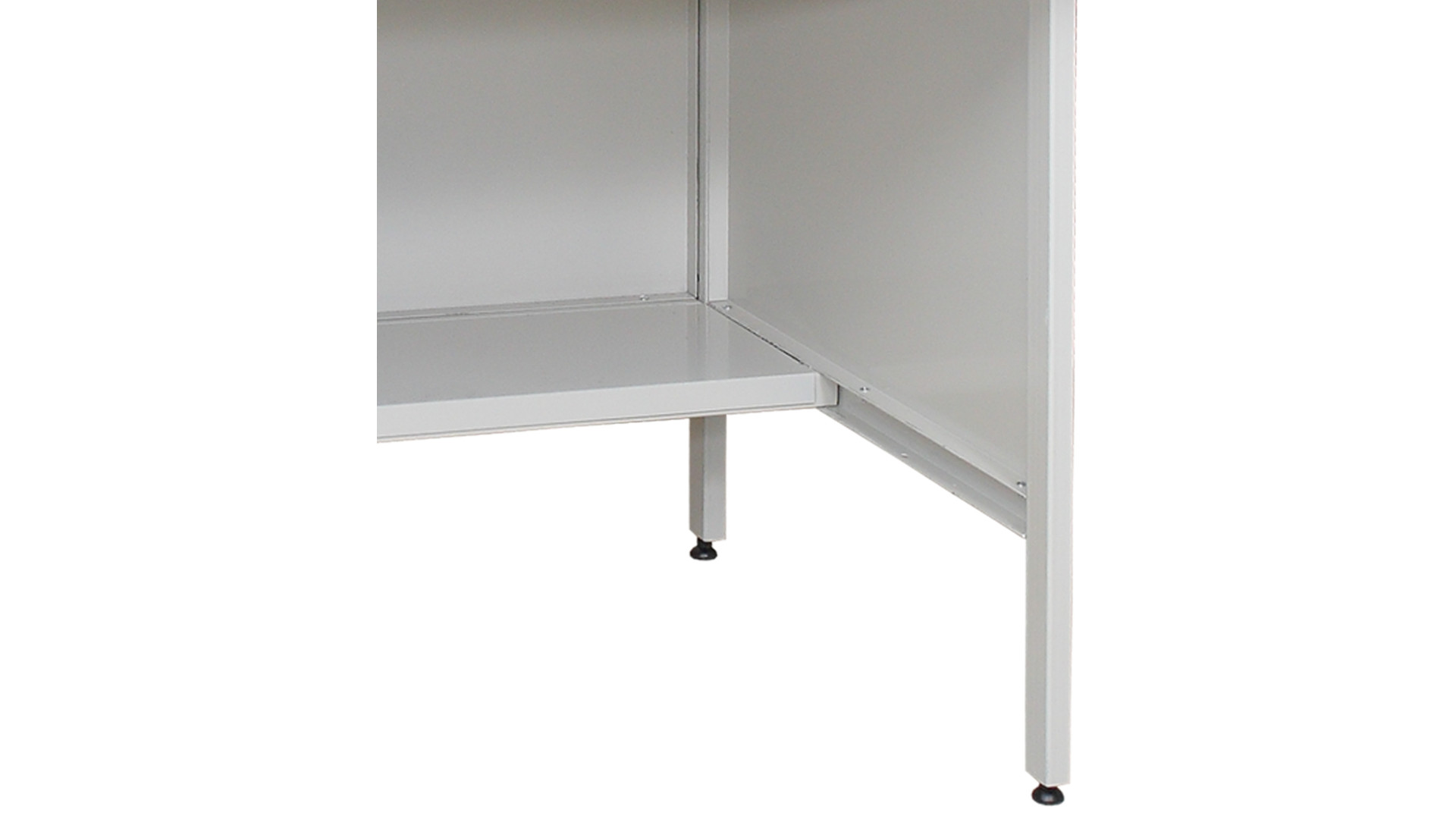 Столешница устойчива к нагрузкам, механическим повреждениям и воздействию влаги, что важно для эксплуатации в производственных и сборочных цехах. Закрытые боковые части конструкции защищают от пыли, брызг и механических повреждений, а нижняя полка под столешницей обеспечивает дополнительное пространство для хранения инструментов или материалов.