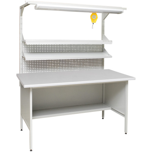 Столешница устойчива к воздействию температуры, механических повреждений и влаги, что важно для эксплуатации в производственных и монтажных цехах. Закрытые боковые части конструкции защищают от пыли и внешних воздействий, а полка под столешницей предоставляет дополнительное пространство для хранения необходимых компонентов.