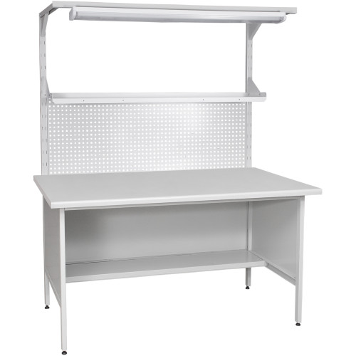 Столешница устойчива к воздействию температуры, механических повреждений и влаги, что важно для эксплуатации в производственных и монтажных цехах. Закрытые боковые части конструкции защищают от пыли и внешних воздействий, а полка под столешницей предоставляет дополнительное пространство для хранения необходимых компонентов.