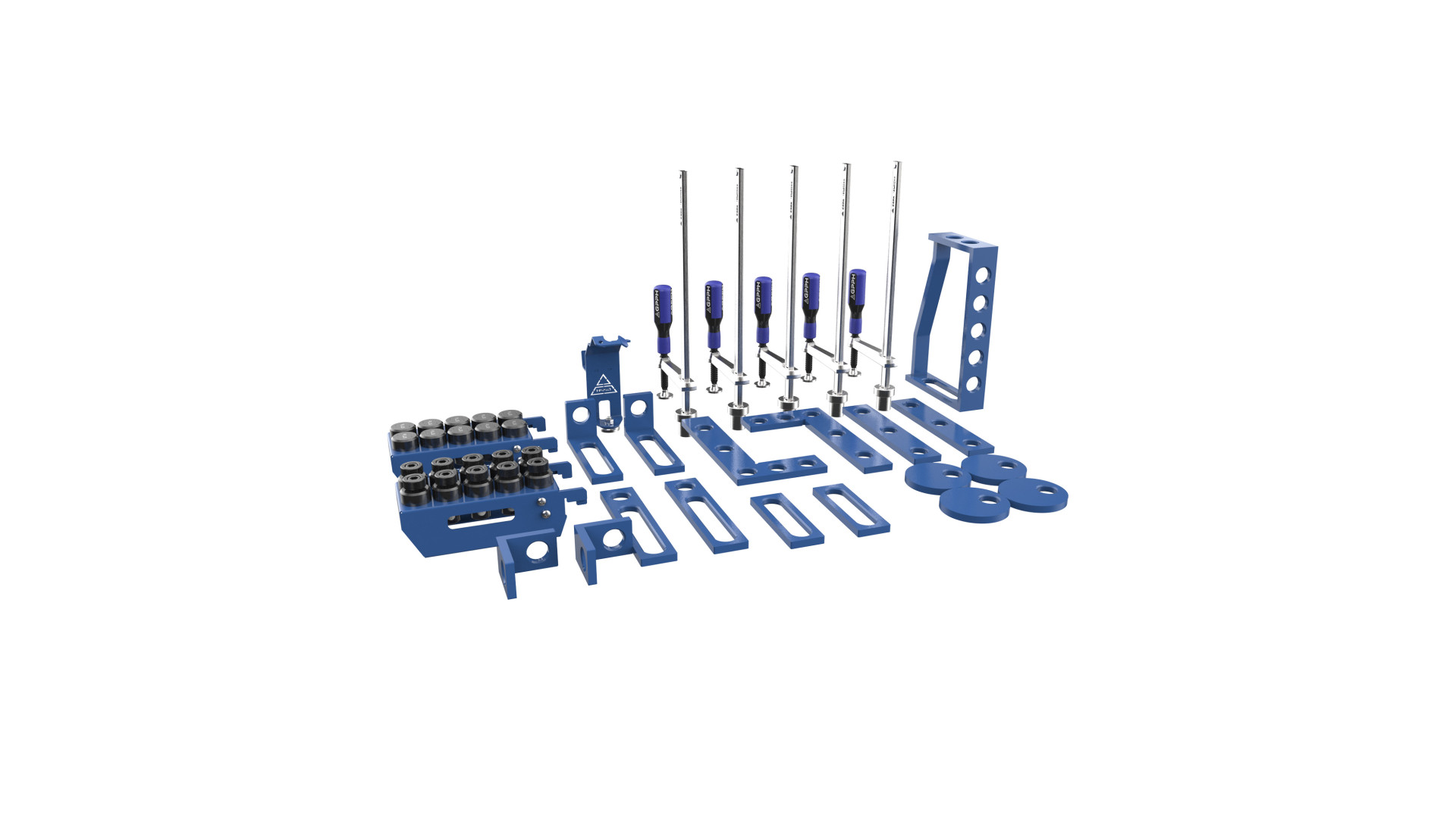 В состав входят 45 элементов, формирующих комплексное решение для фиксации и позиционирования заготовок. Набор содержит 5 рычажных струбцин, 2 планки длиной 150 мм, 2 планки 225 мм и 2 планки 260 мм. В комплект также входят 4 эксцентриковых упора диаметром 100 мм, 2 плоские виньетки размером 275×150 мм, 2 угловые планки 75×75 мм, 2 угловые планки 75×185 мм и одна угловая планка 200×300×150 мм. Кроме того, набор включает 10 крепежных болтов, 10 штифтов для позиционирования, держатель горелки и 2 мобильных стеллажа для беседки S. Каждый элемент совместим с системой отверстий сварочных столов GPPH.