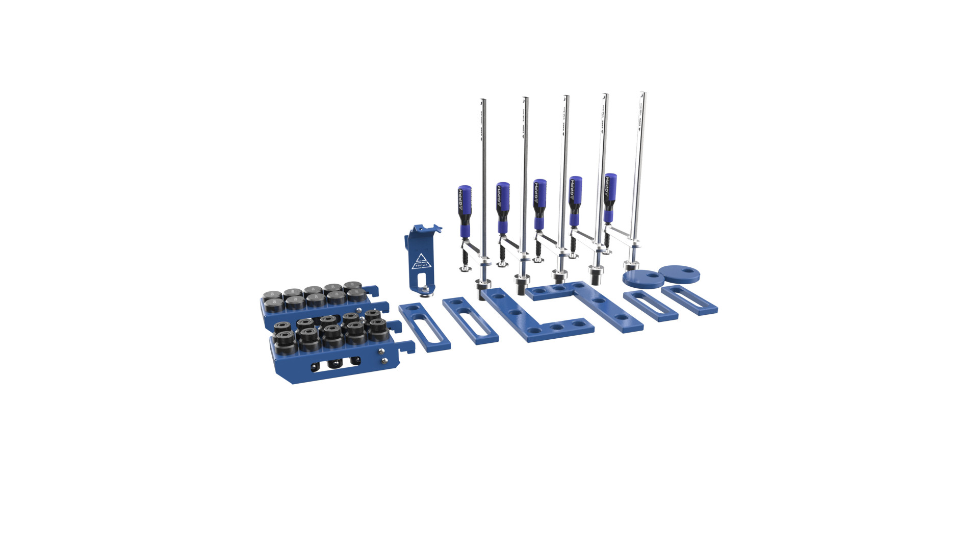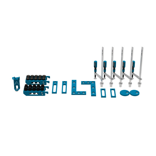 В состав входят 36 элементов, которые формируют полноценный комплект оснащения для фиксации деталей. Набор содержит 5 рычажных струбцин, позволяющих быстро закреплять заготовки различной формы. Также в комплекте предусмотрены 2 планки длиной 150 мм и 2 планки 225 мм, которые используют для формирования опорных зон. Дополнительно набор содержит 2 эксцентриковых упора диаметром 100 мм, 2 плоские виньетки размером 275×150 мм, 10 крепежных болтов, 10 штифтов для позиционирования, держатель горелки и 2 мобильных стеллажа для беседки S. Комплектация позволяет выполнять фиксацию элементов под разными углами и на разной высоте.